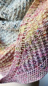 The names that Adella of LolaBean Yarn Co gave these colorways were the inspiration for this shawl. The 80’s British pop was part of my formative years in music. I imagined a shawl that mirrored the