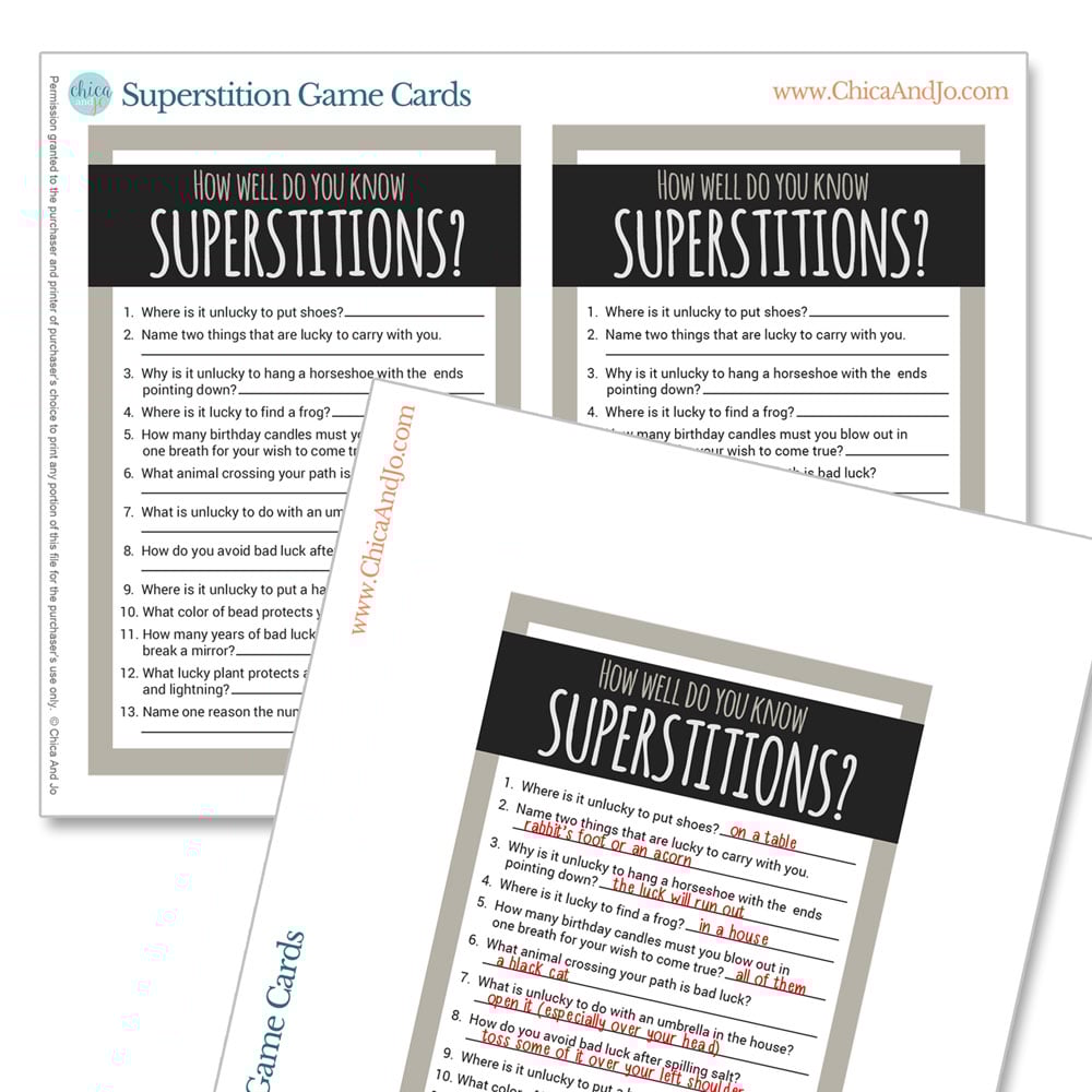 If you're throwing a Superstition Party for Friday the 13th or Halloween, and using some of our ideas, you'll love our printable superstition trivia party game.