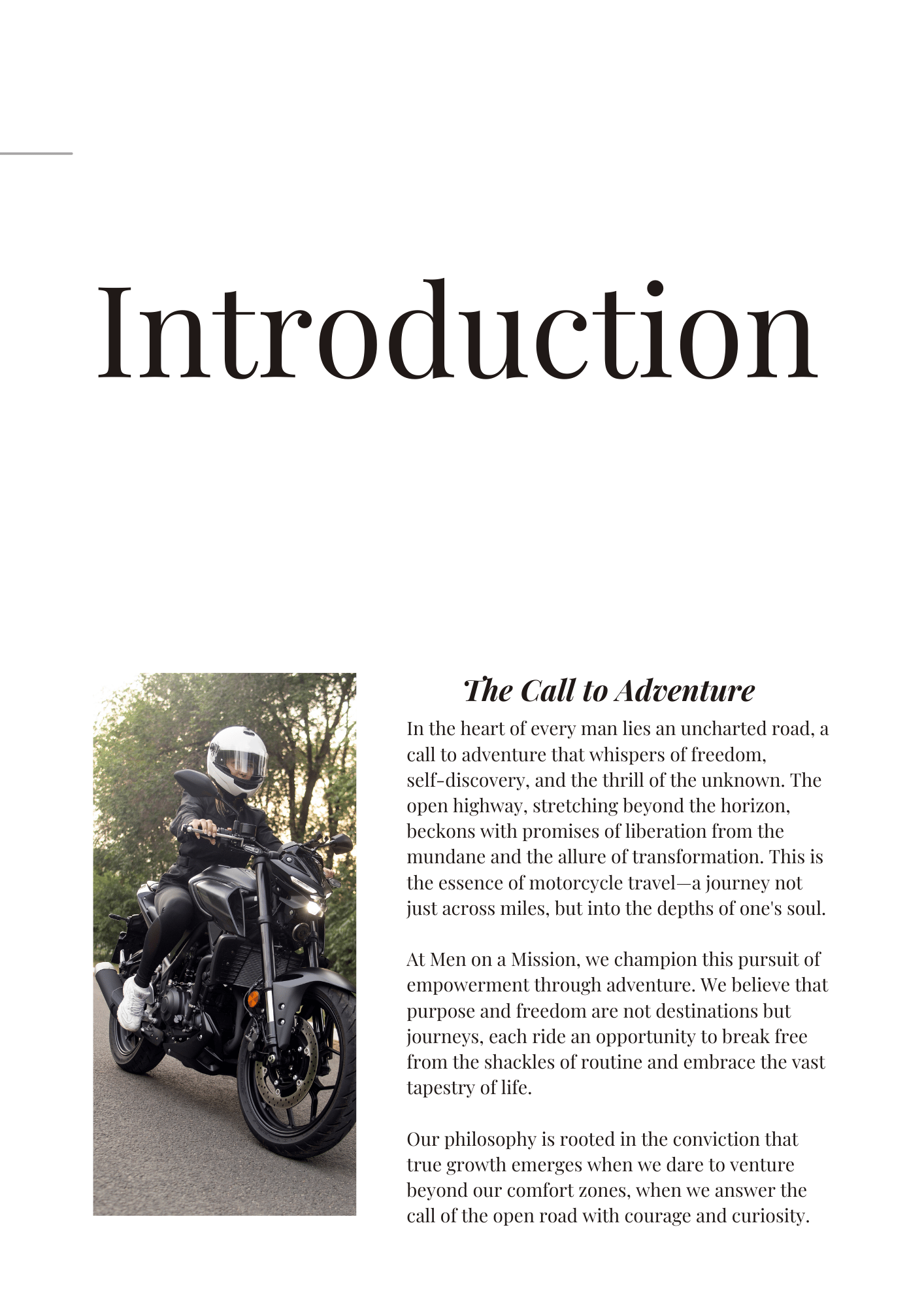 Mindset and Philosophy: Highlights the emotional and mental benefits of motorcycle travel, focusing on resilience, adaptability, and the joy of exploration.