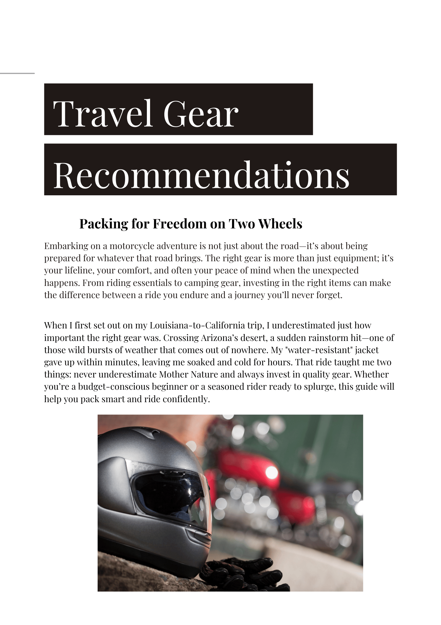 Travel Gear Recommendations: Provides budget-friendly and premium options for essential gear, such as helmets, gloves, jackets, boots, camping gear, and accessories.