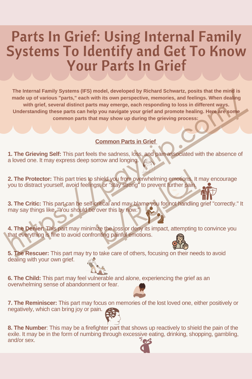 The Internal Family Systems (IFS) model, developed by Richard Schwartz, posits that the mind is made up of various "parts," each with its own perspective, memories, and feelings. When dealing with grief, several distinct parts may emerge, each responding to loss in different ways. This worksheet aims to help individuals to understand these parts in an effort to help you navigate your grief and promote healing.