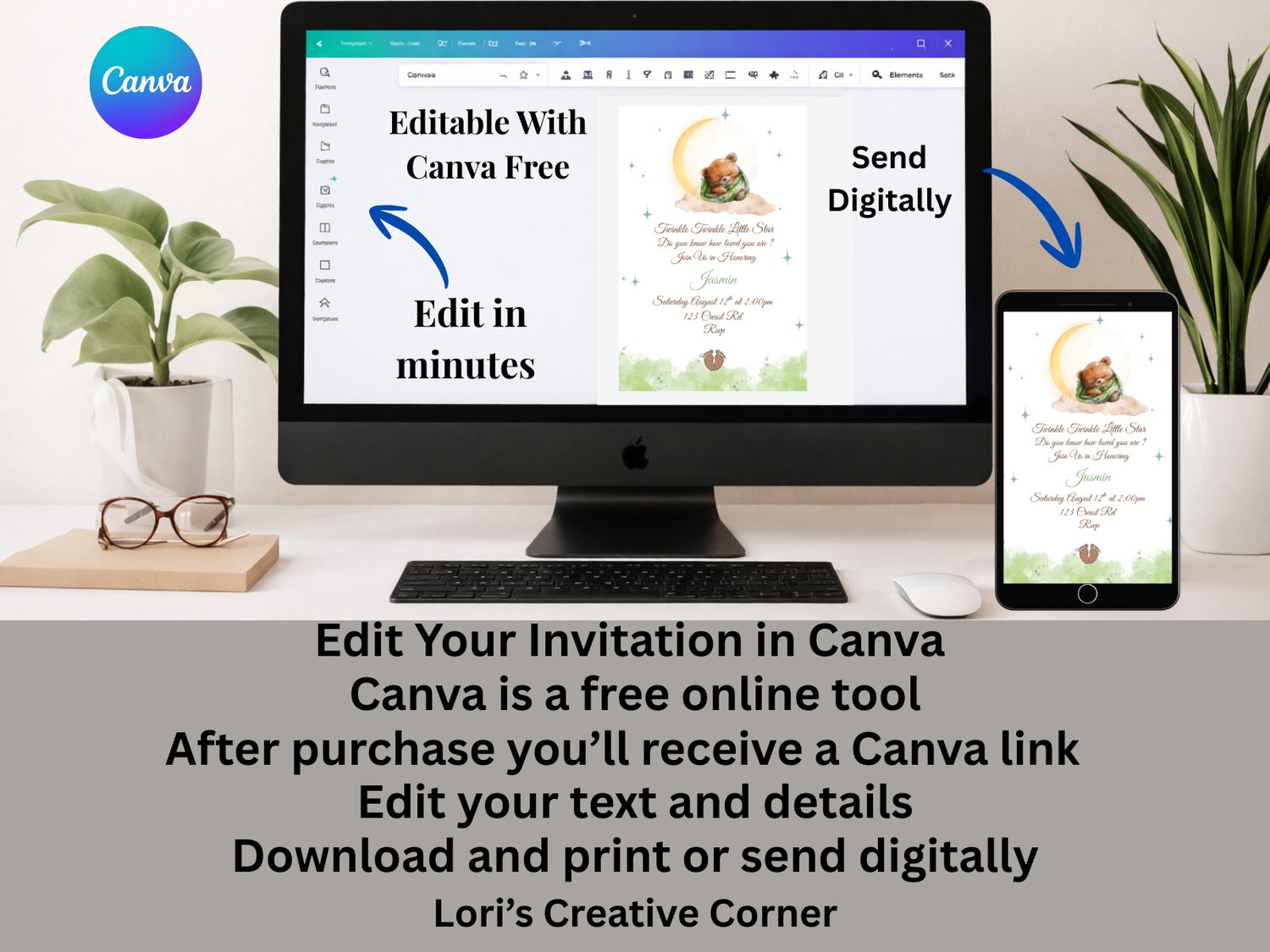 • Editable Canva Template – customize name, date, time, location, and more