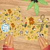 Barnyard animals, sunflowers and daisy flowers.