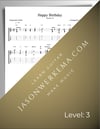 Fingerstyle guitar arrangement of "Happy Birthday" (level 3) with music notation, left-hand fingerings, chord symbols, TABs, and mp3 file.