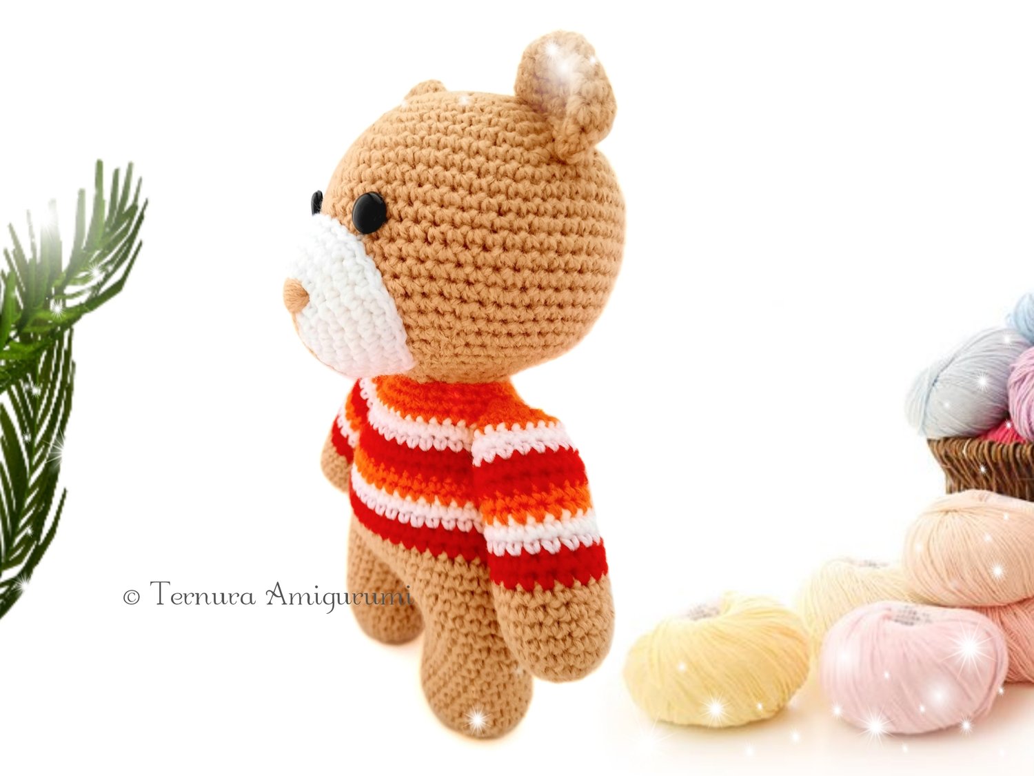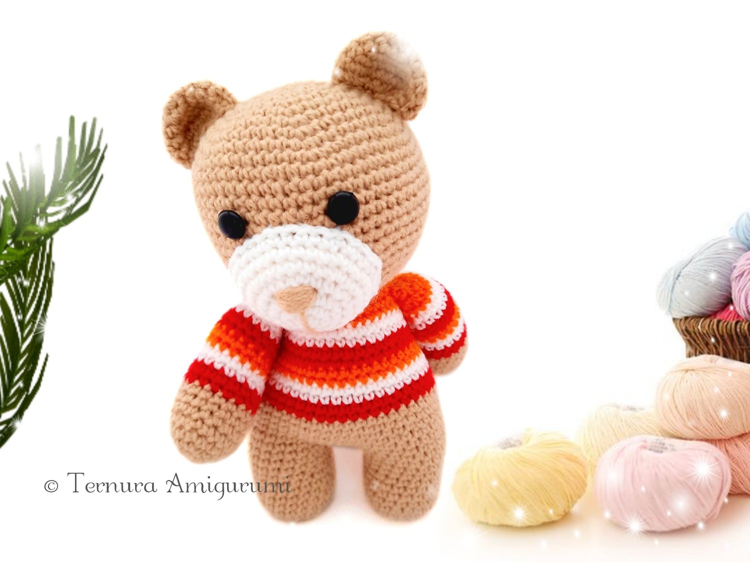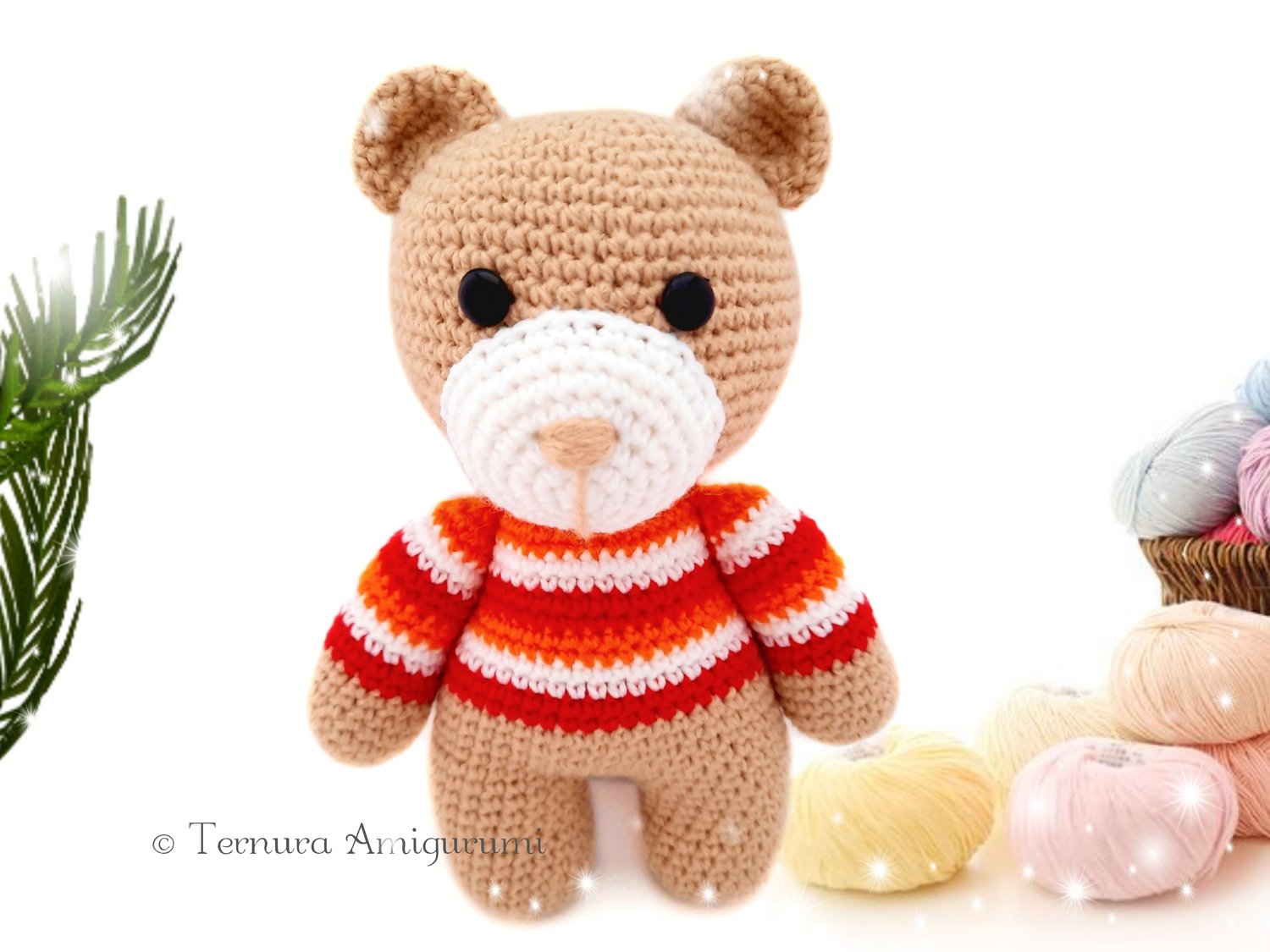 I present to you Noah!, a sweet bear with a colorful sweater! It's very quick and fun to do. You can make the color combination you like best and give it to someone special! It is a good gift for children and also for Valentine's Day! Get started right away with this crochet pattern! The finished dimensions are approximately 23 cm. The size may vary depending on the size of the needle and thread.