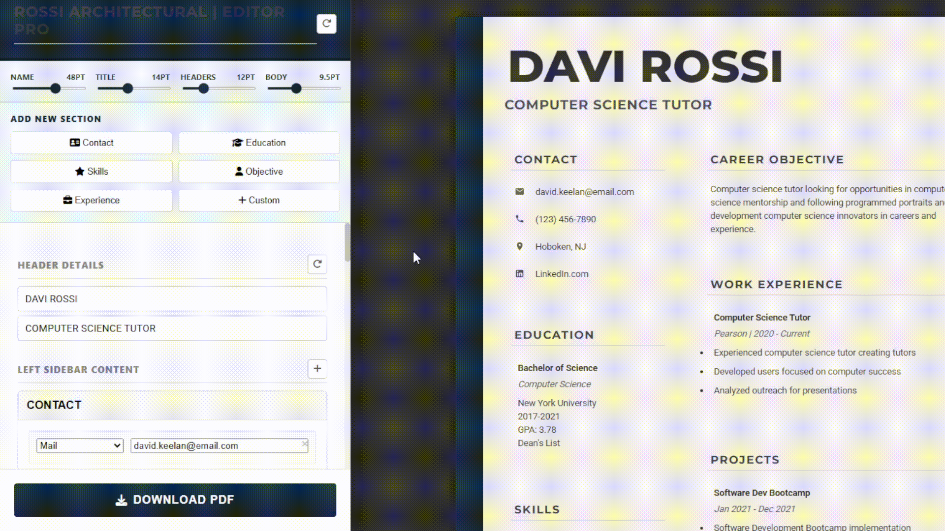 - Portfolio Integration: Prominent fields for your GitHub, LinkedIn, and personal site.