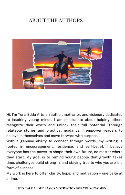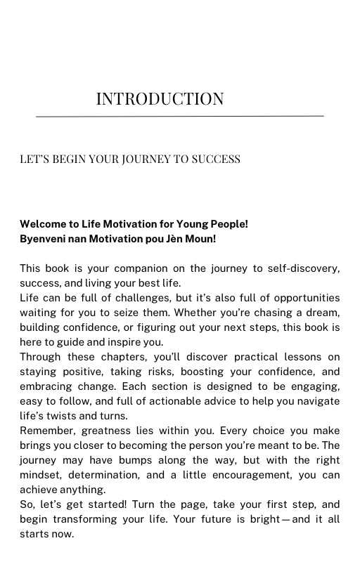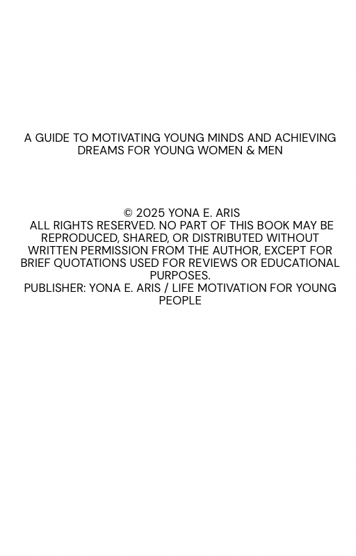 Life Motivation for Young People: A Guide to Self-Discovery, Success, and Living Your Best Life is a practical and inspiring guide for teens and young adults looking to unlock their potential. This book offers clear, actionable advice on building confidence, staying positive, embracing change, setting goals, and overcoming challenges. Each chapter is designed to motivate, guide, and empower readers to take control of their journey and create a life full of purpose, resilience, and achievement.