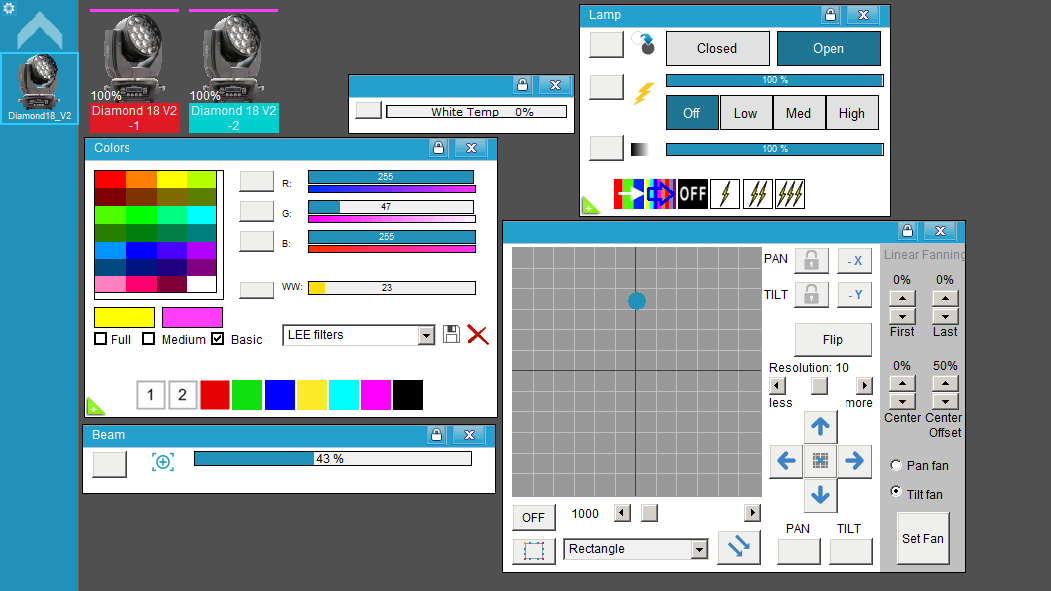 * Verifique, con un Fixture de pruebas (click), que coincidan estos canales: 4 Pan, 6 Tilt, 2 Dimmer, 13 Blanco, 1 Strobo.