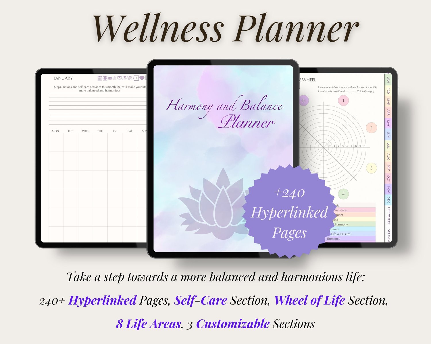 This planner is more than just organization — it’s your guide to harmony, mindfulness, and growth. With 240+ hyperlinked pages, self-care templates, and reflection tools, you’ll stay grounded while building healthier habits.