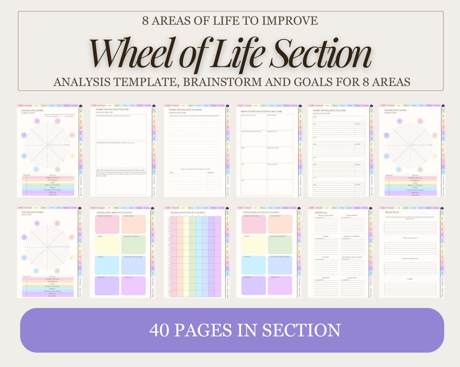 ✔️ Wheel of Life Section – 40+ pages & 17 templates to explore 8 life areas: Health, Career, Finance, Leisure, Romance, Balance, Development & Community.