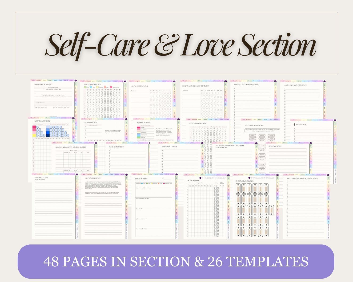 ✔️ Self-Care & Love Section – 48+ pages with trackers for wellness, gratitude, self-love, meditation & more.