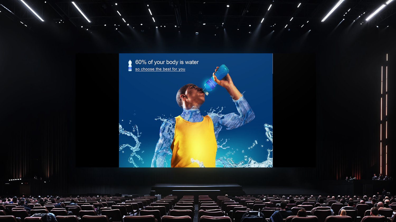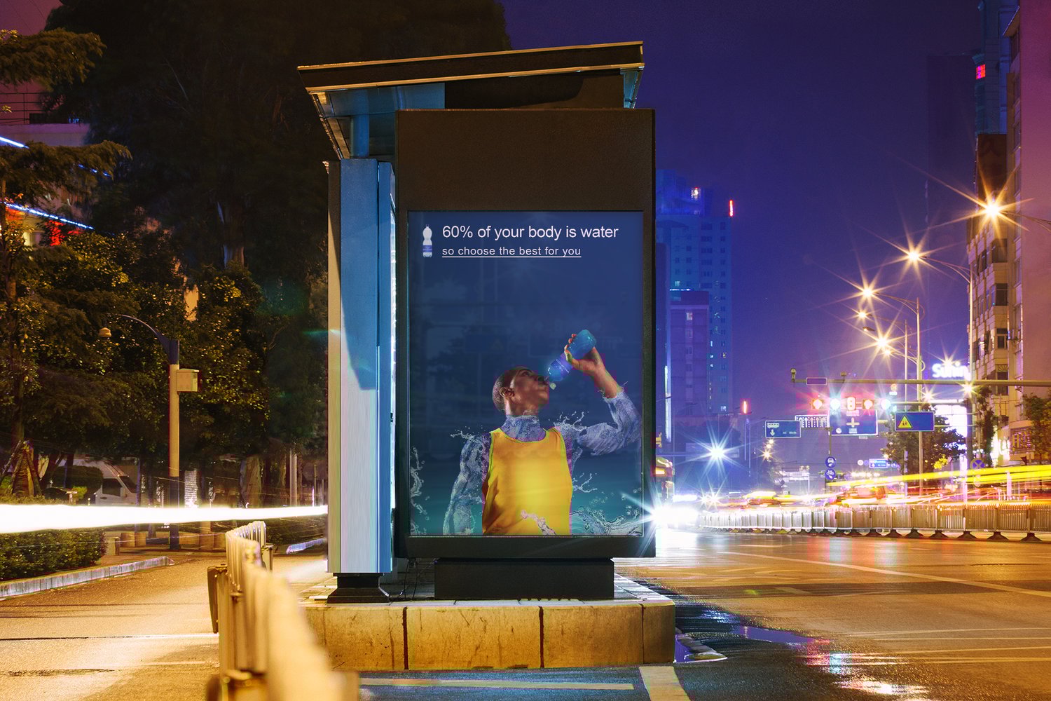 Capture the essence of hydration with this stunning visual. A man transformed into a fluid, water-like figure drinks from a bottle, set against a clean blue background symbolizing purity. Highlighted with a bold claim - “78% of the human body is water” - this ad is crafted for water brands aiming to connect with health, clarity, and life itself.