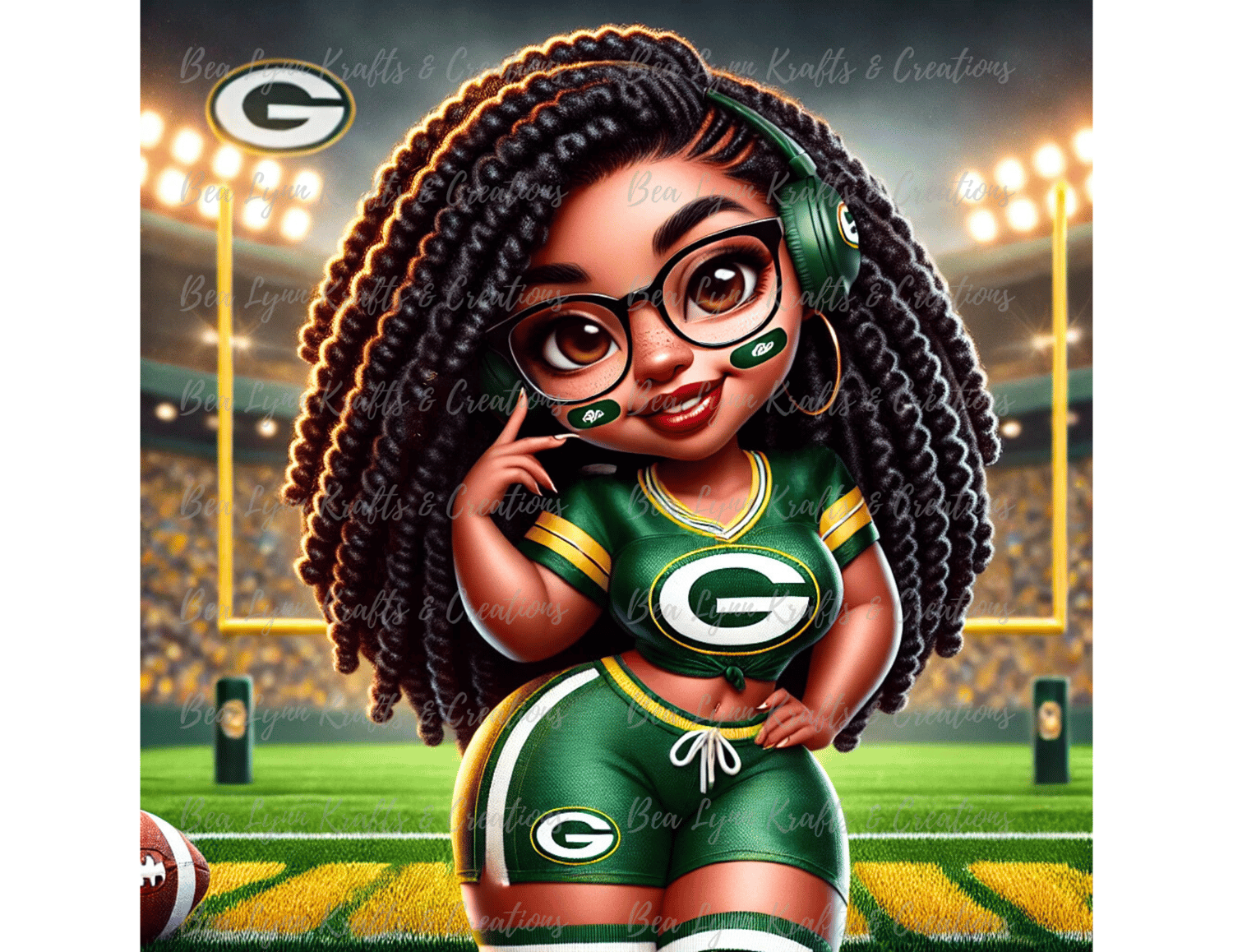 Get ready to cheer on the Green Bay Packers with this vibrant, high-energy sports fan avatar! This bold and dynamic illustration features a passionate fan dressed in an authentic Packers uniform, complete with a green and yellow jersey, matching athletic pants, and face paint for game-day flair. The football-themed background includes stadium lights, goalposts, and a roaring crowd, perfectly capturing the electrifying atmosphere of game day!