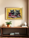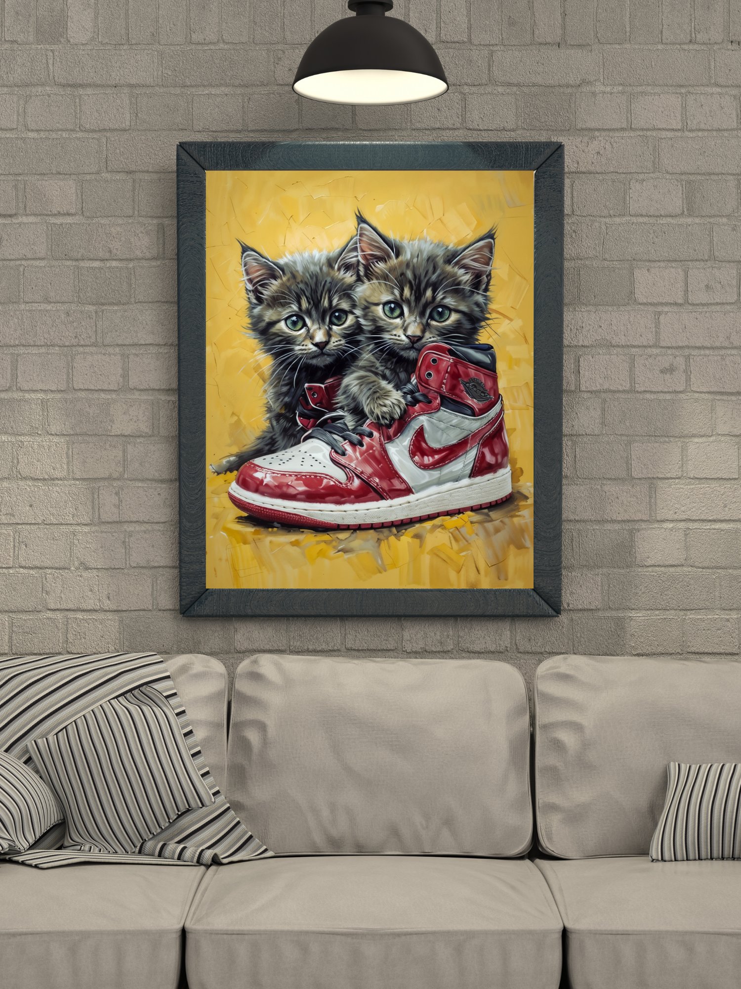 Looking for the purrfect blend of style and cuteness? Meet our Sneaker Kittens Digital Wall Art — a high-resolution printable featuring two fluffy tabby kittens snuggled inside a classic red sneaker (Air Jordan style!). With a bold yellow backdrop, this playful artwork is perfect for sneakerheads, cat lovers, or anyone who loves quirky, trendy decor.