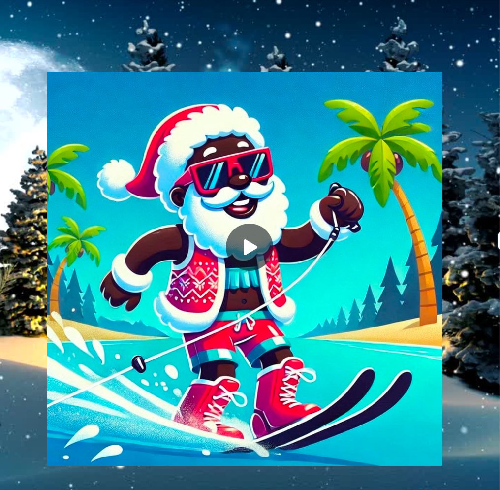 A vibrant digital illustration of a Black Santa wearing a red and white Santa suit, confidently water skiing.