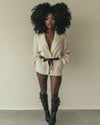 Beautiful Black Woman with Big Curly Hair Wearing a Cream Sweater Black Knee High Boots, Autumn