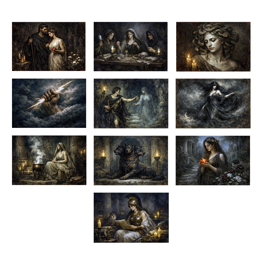 Inspired by classical mythology and vintage scholarly aesthetics, this series features dramatic scenes and iconic figures from Greek myth, including Hades and Persephone, the Three Fates, Medusa, and other legendary symbols of fate, prophecy, and the underworld.
