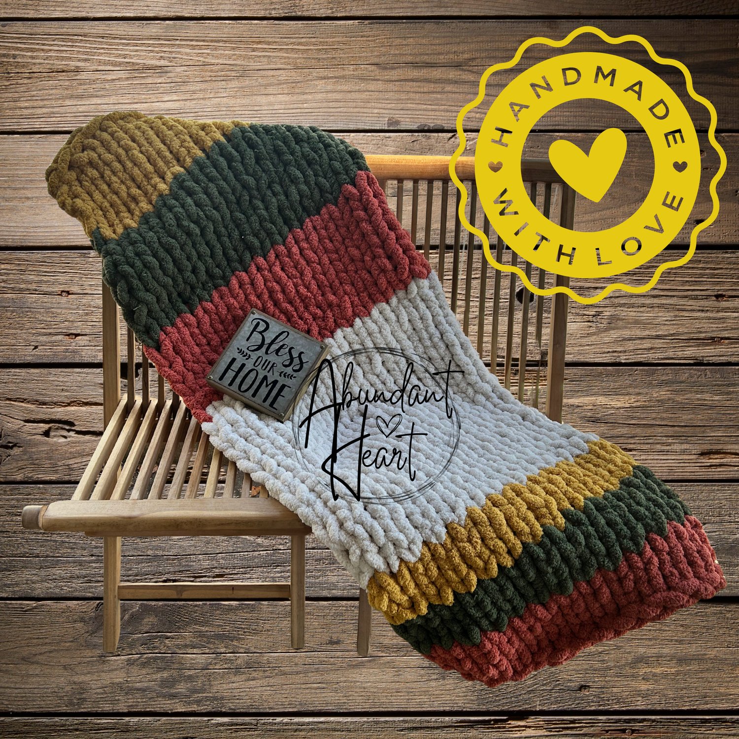 Bring warmth, comfort, and beautiful autumn-inspired style into your home with this handcrafted chunky yarn throw blanket. Designed with rich, earthy tones, this blanket features bold color-block stripes in mustard gold, deep forest green, rusty red, and soft cream—a perfect palette for fall décor or year-round coziness.