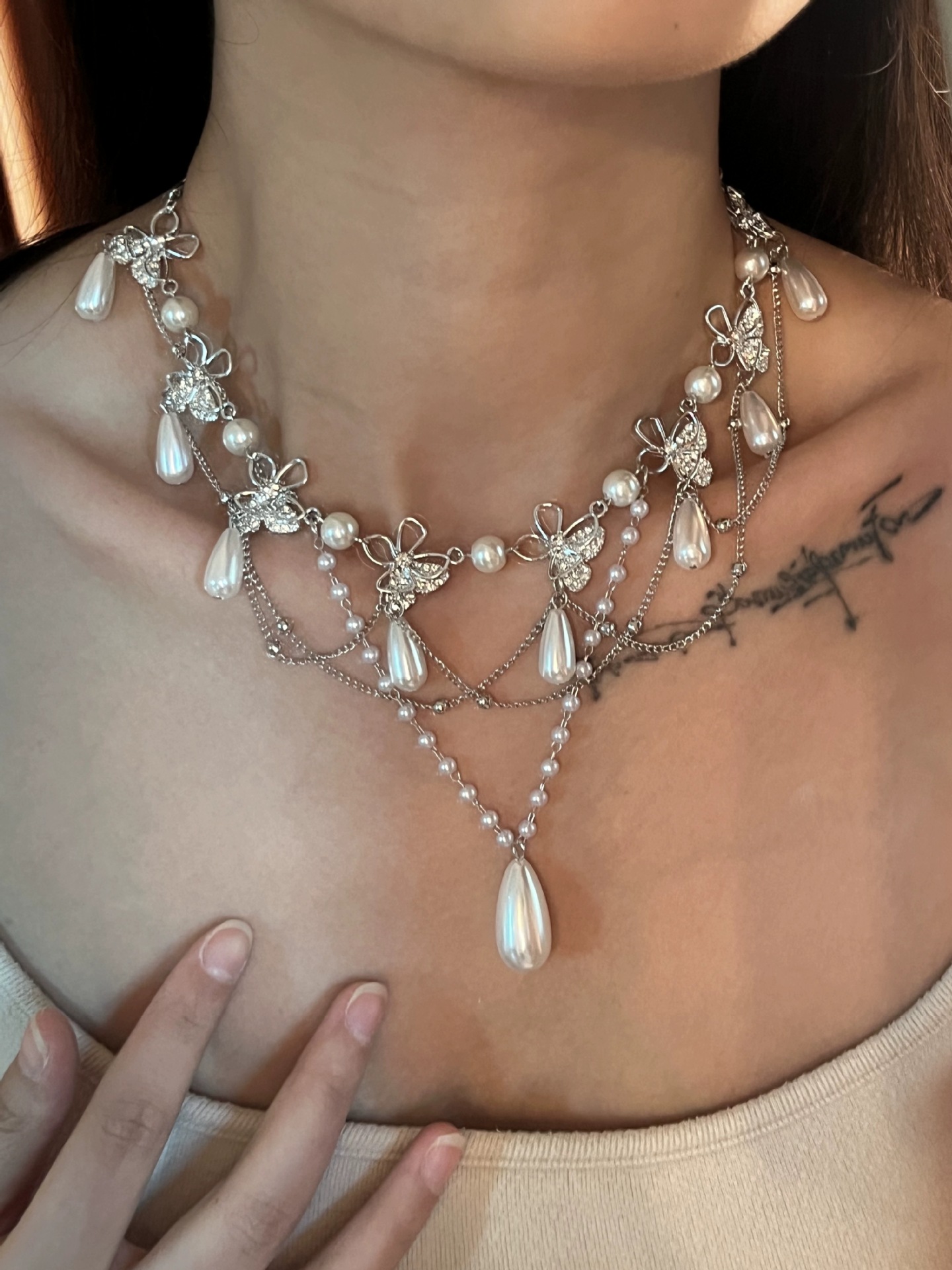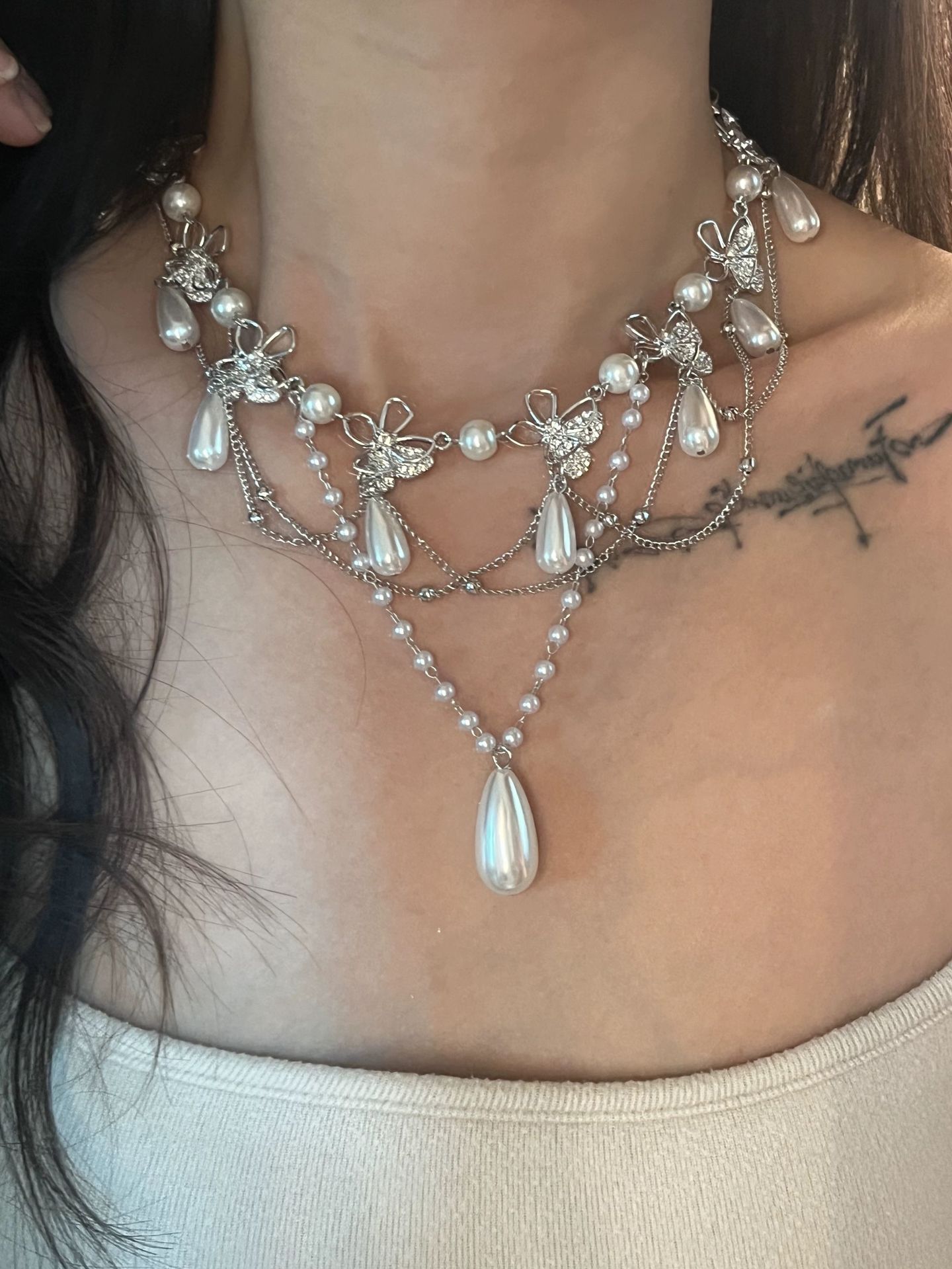Vintage luxury fairycore butterfly pearl tassel choker necklace