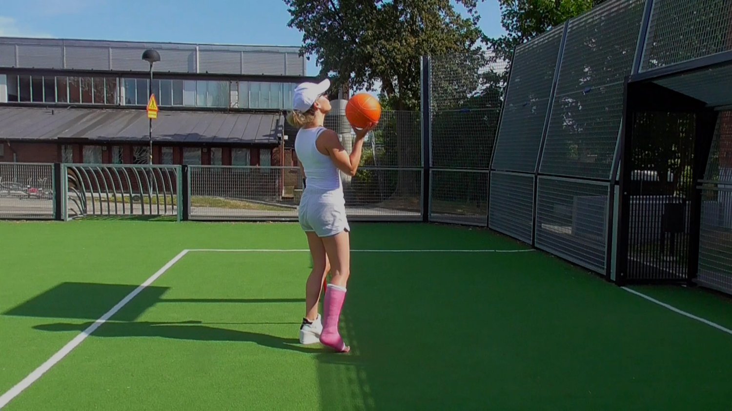 Ice is crutching from a distance towards the camera with her right leg casted in a pink SLC, she’s dressed up in a sporty outfit and is on her way to play some basketball today. Ice puts down her casted foot carefully to the ground and walks slowly on it with the help of one crutch. She starts off by walking carefully bouncing the ball as she moves towards the hoop. It’s not easy but Ice still manages to make one of the shoots, way to go! She limps back to the court and keeps on tossing the ball again and again, until it gets exhausting. She later puts her casted leg up on one crutch, is she going to make the shoot in this stance? Wow! After doing that, Ice needed to take a break before she continues to play some more. Then there’s a nice close up of her casted foot resting on the ground too.