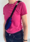Start with 3/4" (2 cm) or 1" (2.5 cm) elastic or webbing, add a slider, a D-ring and a side release buckle. (The D-ring is a secure place to fasten your keys so they don’t fall out when you answer your phone.) Then at just the right spot add a 4-way stretchy pouch that has a clever fold allowing it to lie smoothly when empty but which expands to fit your secret little items.