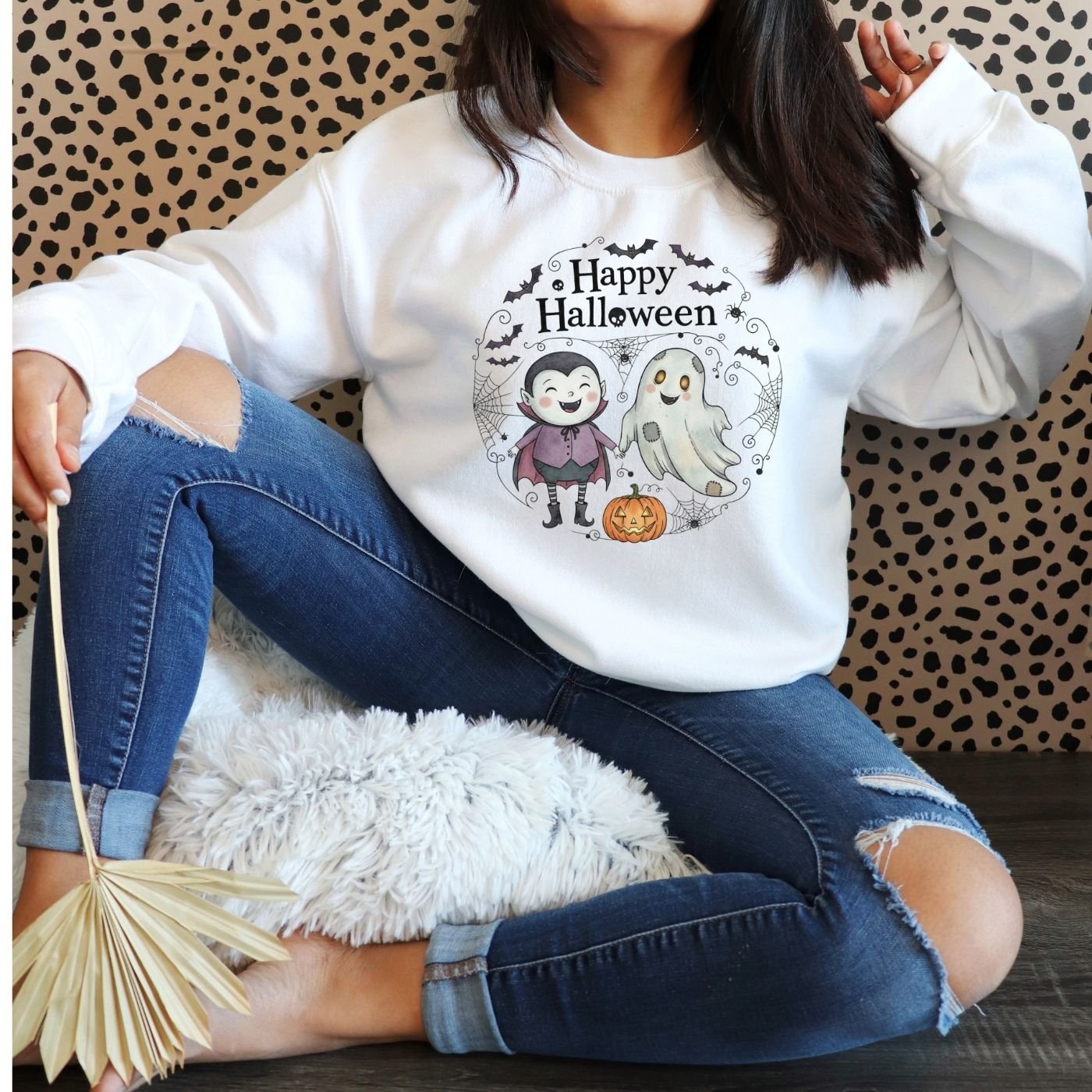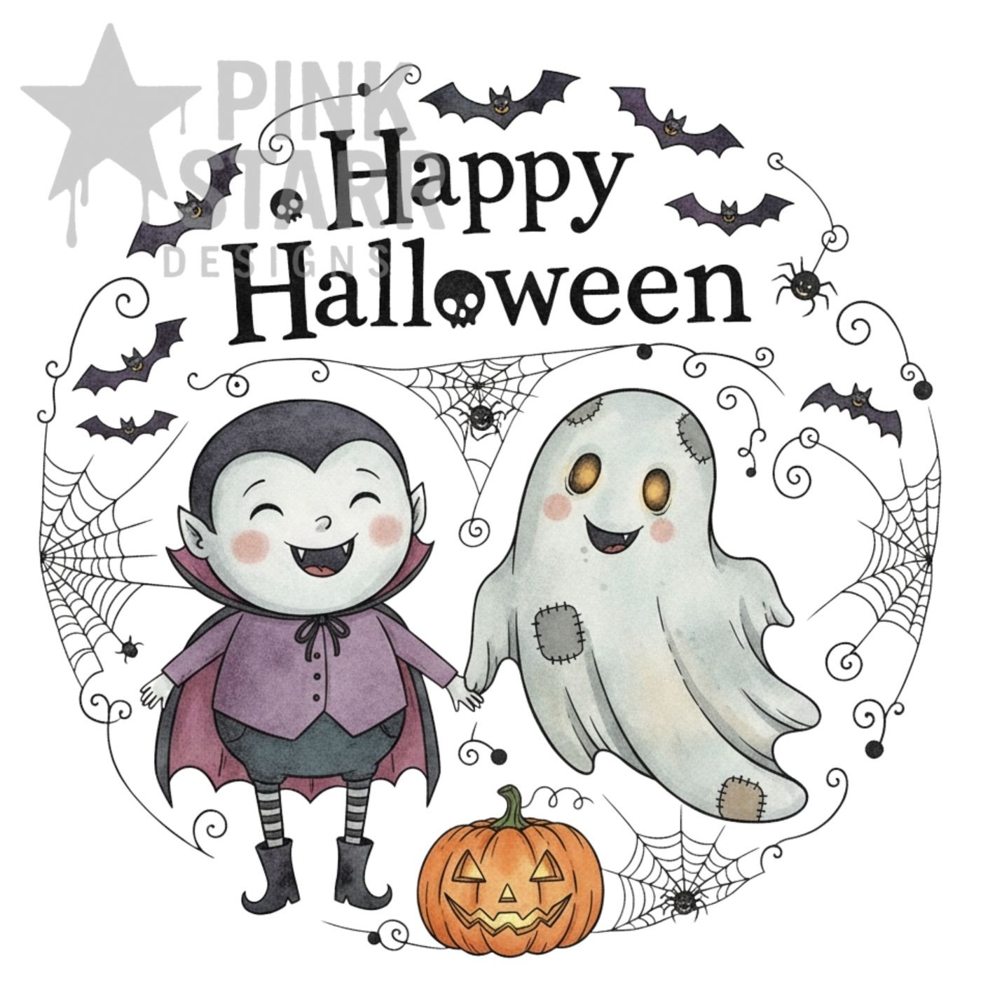 Whimsical Gothic Vampire and Ghost Halloween PNG | Cute Storybook Style Sublimation Design | Vintage Watercolor Happy Halloween Art