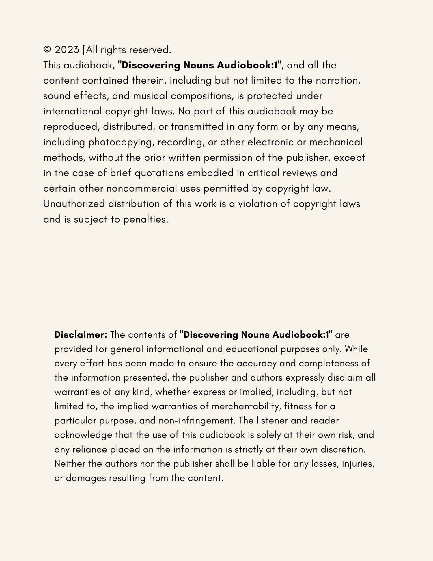 Embark on an auditory and literary journey with "Discovering Nouns Audiobook:1" and its meticulously crafted companion eBook. Dive deep into the world of nouns as lively narratives come to life, making learning effortless and delightful. With every turn of the page and every resonant voice note, listeners and readers of all ages will uncover the magic behind people, places, and things.