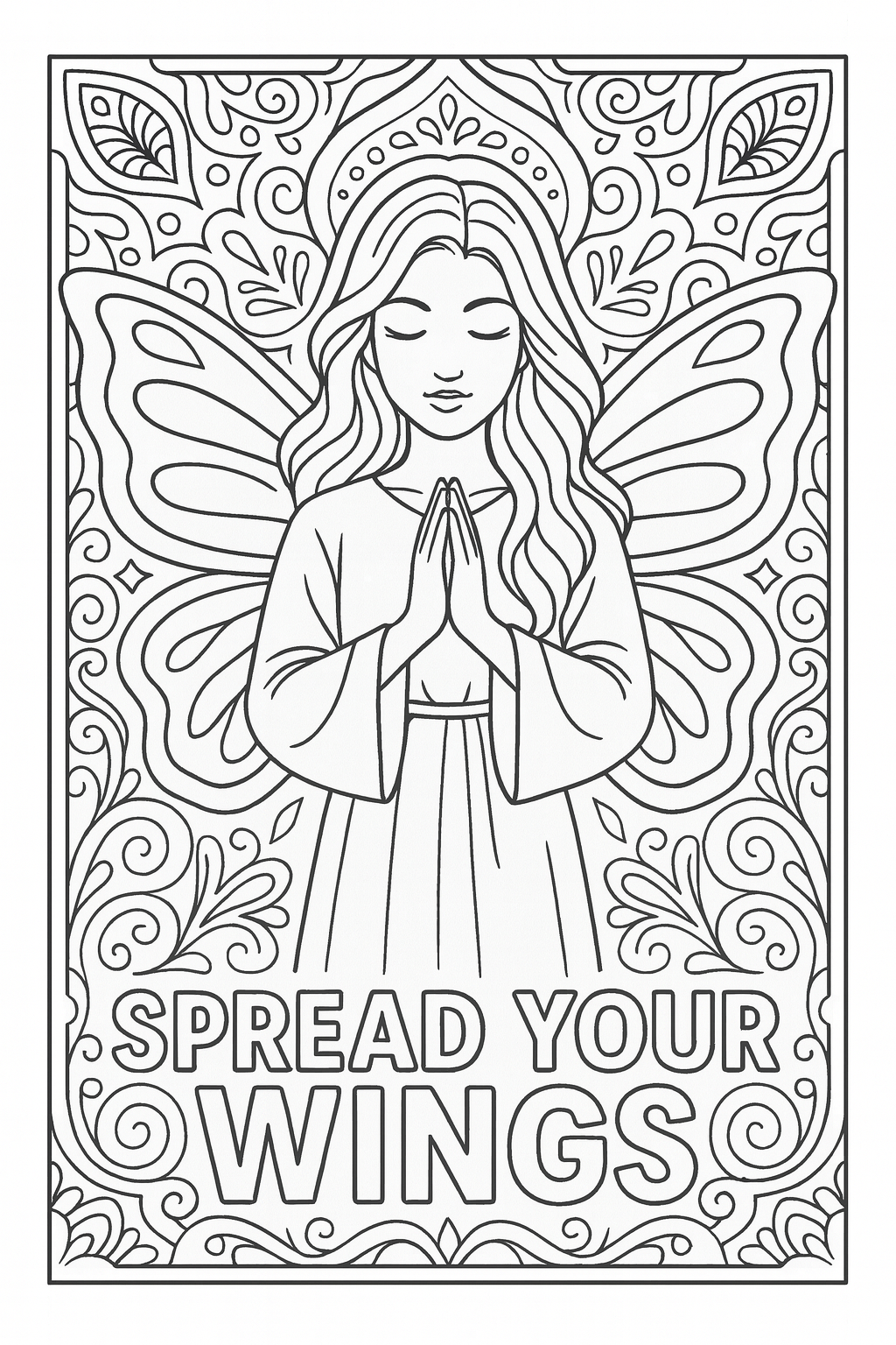 Empower hearts and calm minds with this Inspirational Angel Coloring Page, featuring a serene winged figure in prayer surrounded by intricate floral and swirl patterns. With the bold affirmation “SPREAD YOUR WINGS” at the bottom, this printable invites reflection, creativity, and spiritual growth — perfect for wellness kits, journaling prompts, or quiet devotional time.