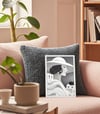 The profile of the woman is soft and idealized, blending classical beauty with a contemporary graphic sensibility.
