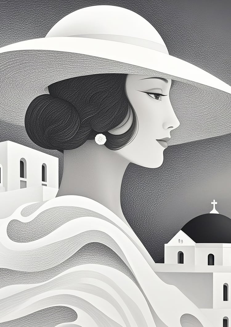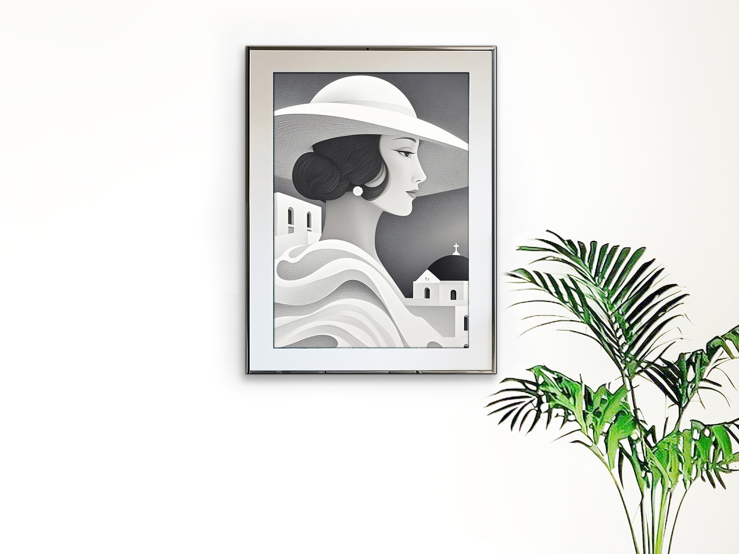 Elegant Art Deco Woman with Santorini Architecture – Monochrome Modern Wall Art Print uk030