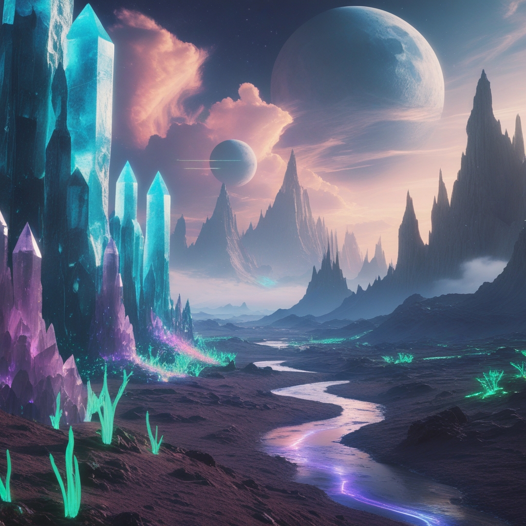 A breathtaking scene of a distant alien planet with a surreal, otherworldly landscape. Towering crystal formations rise from the ground, glowing faintly in shades of turquoise and violet. Bioluminescent plants illuminate the terrain with soft neon blues and greens. The sky is filled with swirling pastel-colored nebula clouds, and two massive moons hang low on the horizon.