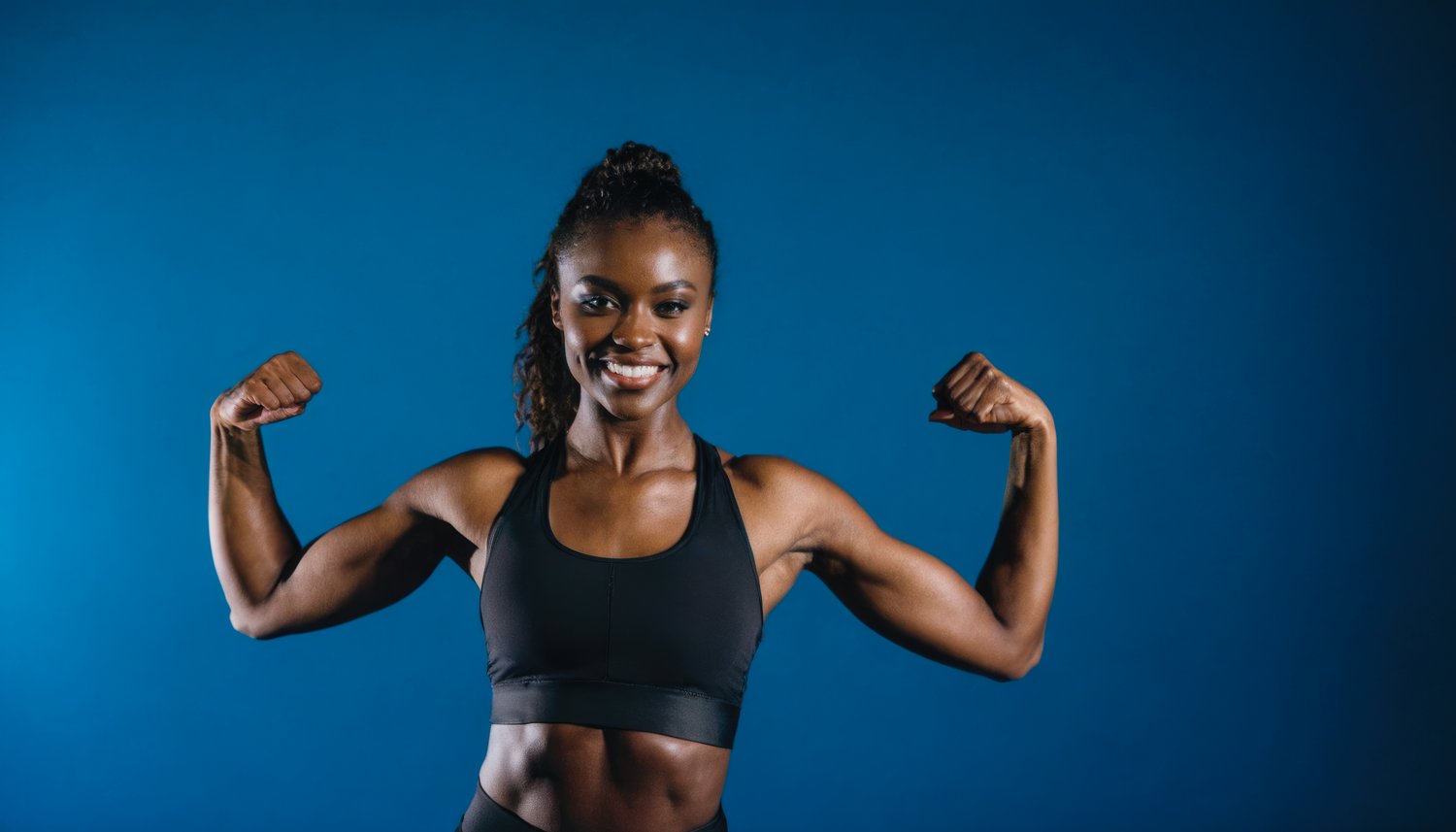 Empowering image of African American Woman Showing off Muscles in front of Blue Background. Active Lifestyle Concept