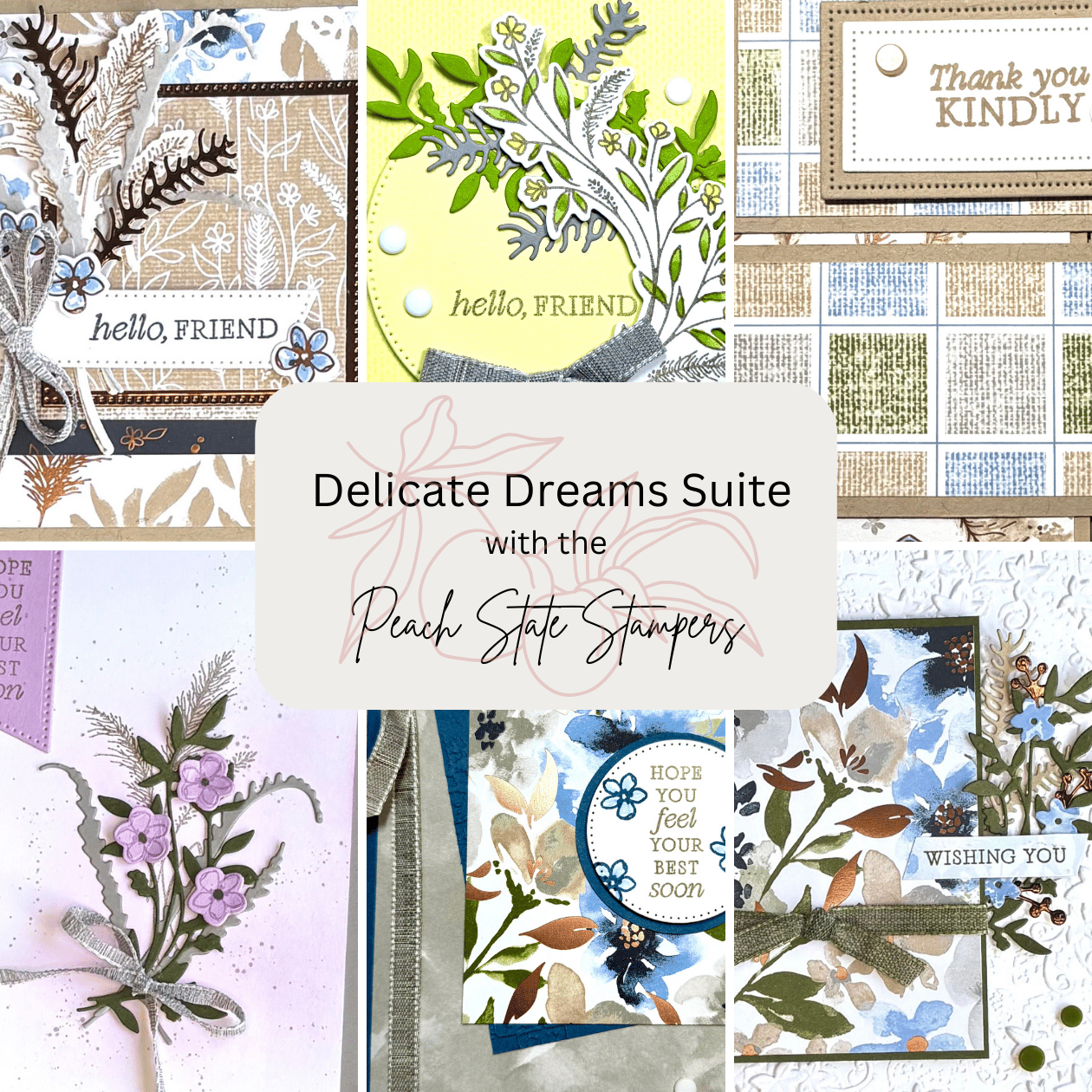 Get ready to mix, match, and make magic with the Delicate Dreams Suite Collection! Featuring hand-drawn florals, modern patterns, and bronze foil shine, this collection includes stamps, dies, papers, dots, and ribbon—all perfectly coordinated. It’s your go-to for effortless, polished cards and the Peach State Stampers have created six (6) gorgeous projects highlighting the beauty of the suite. The Delicate Dreams tutorial includes step-by-step instructions and cut dimensions for each project.