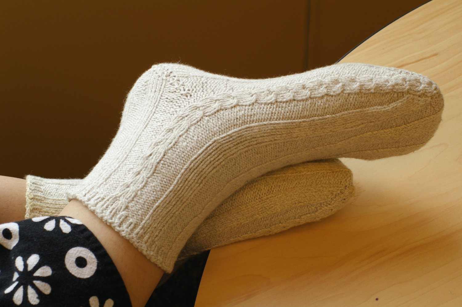 Cabled socks are lovely, and ribbed socks always fit so nicely, but it can be a challenge to pair the two techniques. In this toe-up pattern, a simple cable twist pattern flows up the sides of the sock from toe to cuff while ribbing fills in the space on the instep and sole. The pattern is maintained over the short-row heel. In all ways this sock is centered on comfort; the thick cotton/silver/lycra yarn cushions and coddles the feet, a slight gusset keeps the heel from binding, and the short leg allows for comfort even in the warmest months. These are quick, happy socks, with just a twist of cable along the sides!