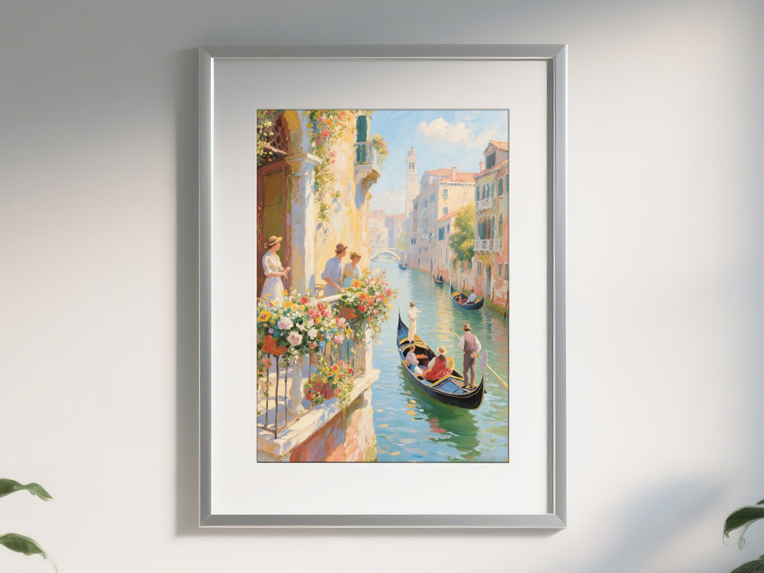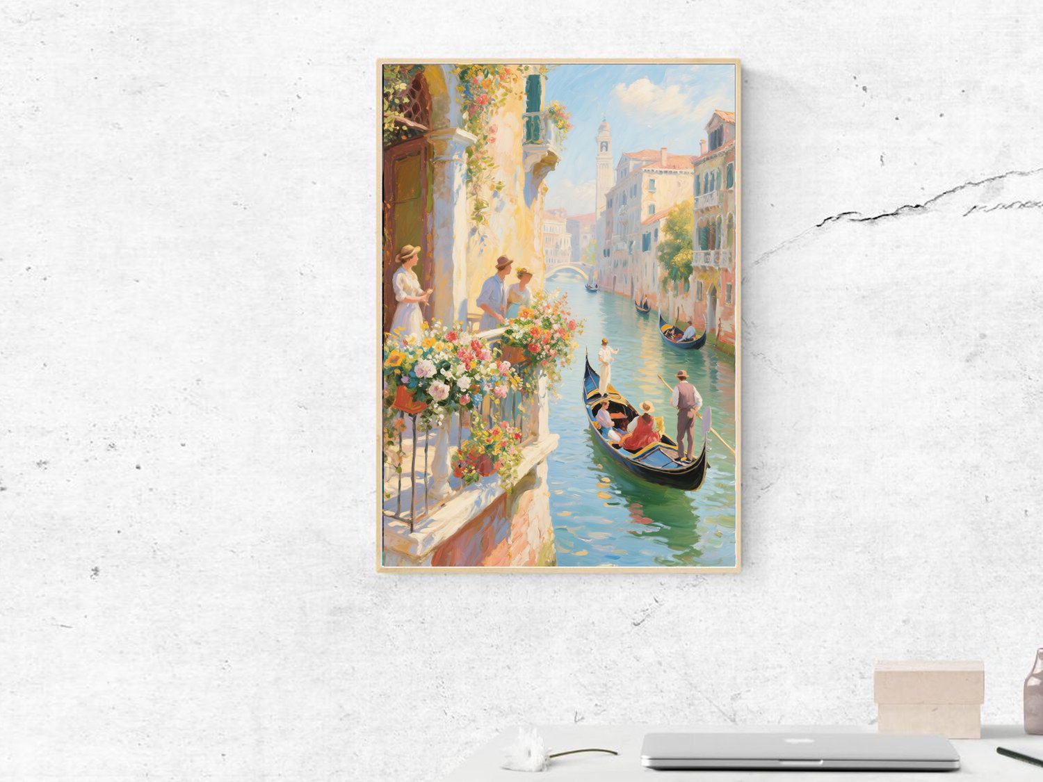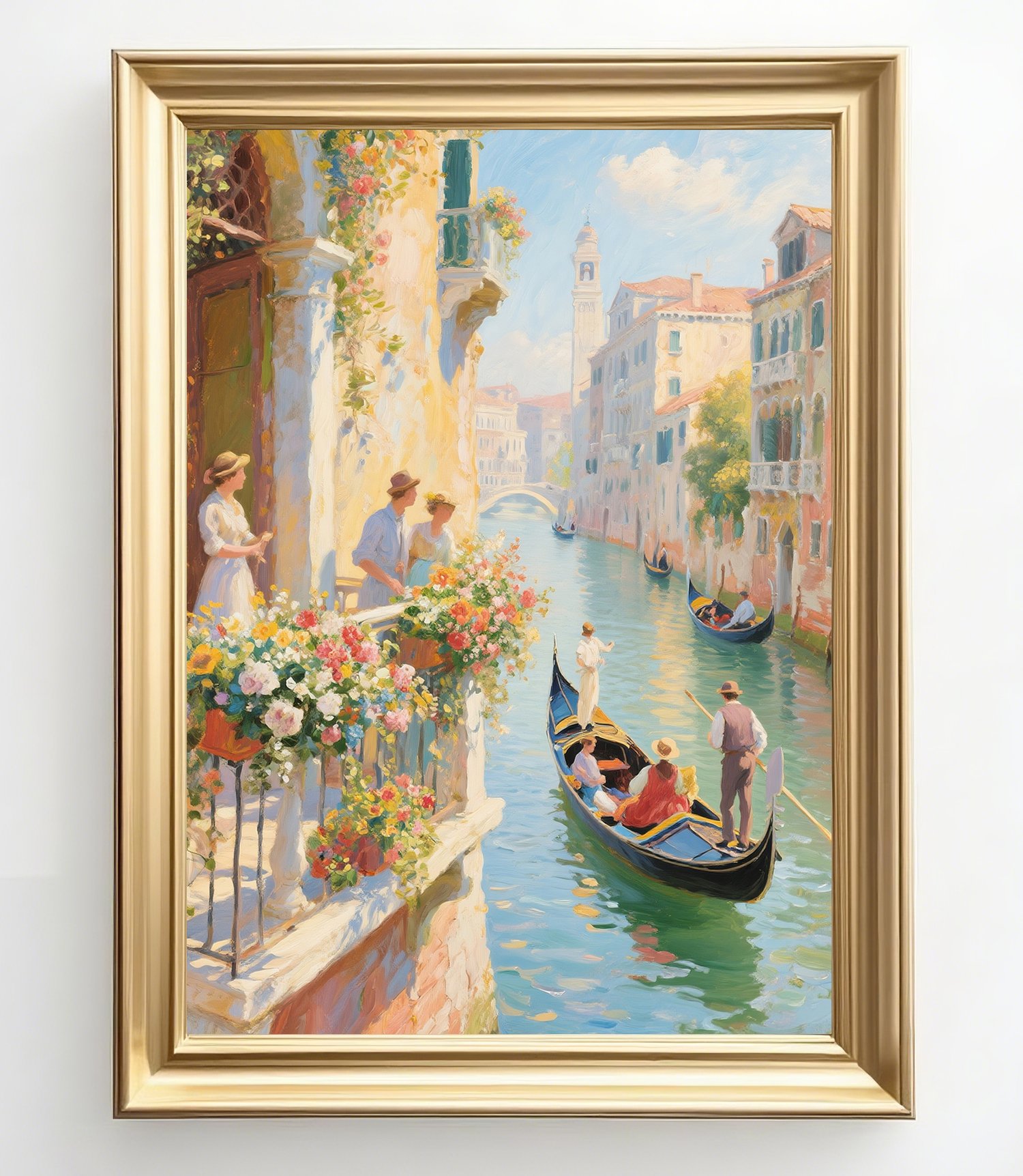 Flowers on the balcony along the canal add elements of health, healing, and personal growth. Hanging this artwork in your space helps cultivate balance, emotional calm, and energetic flow—perfect for manifesting prosperity and well-being in your everyday life.