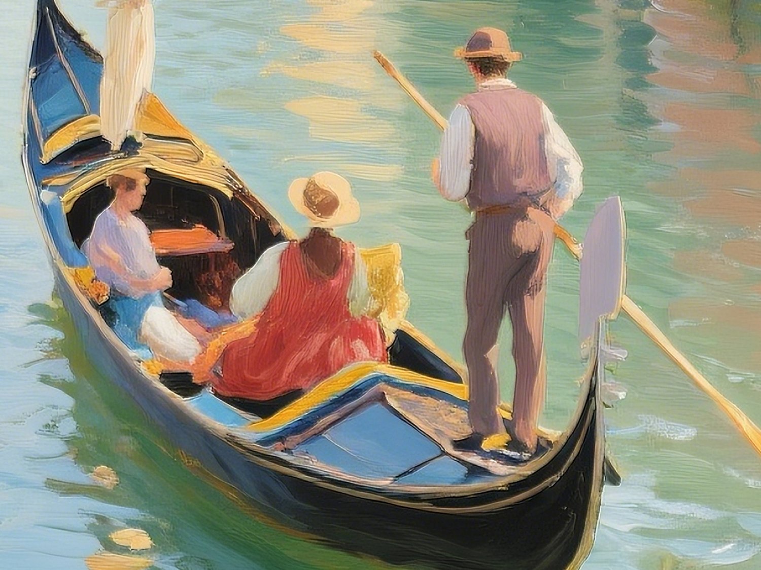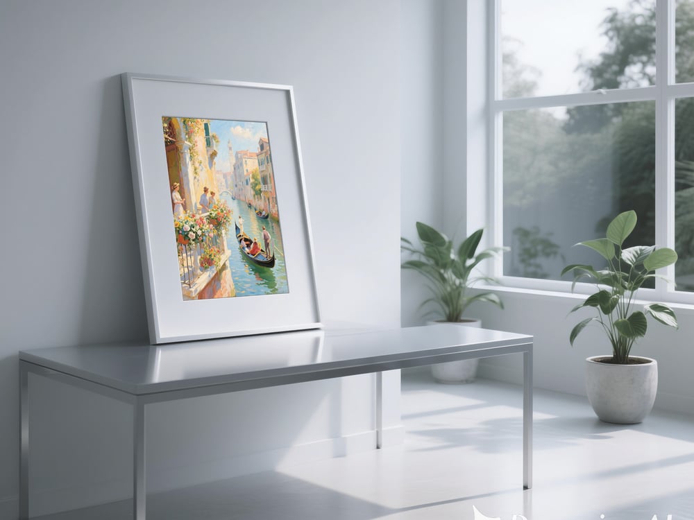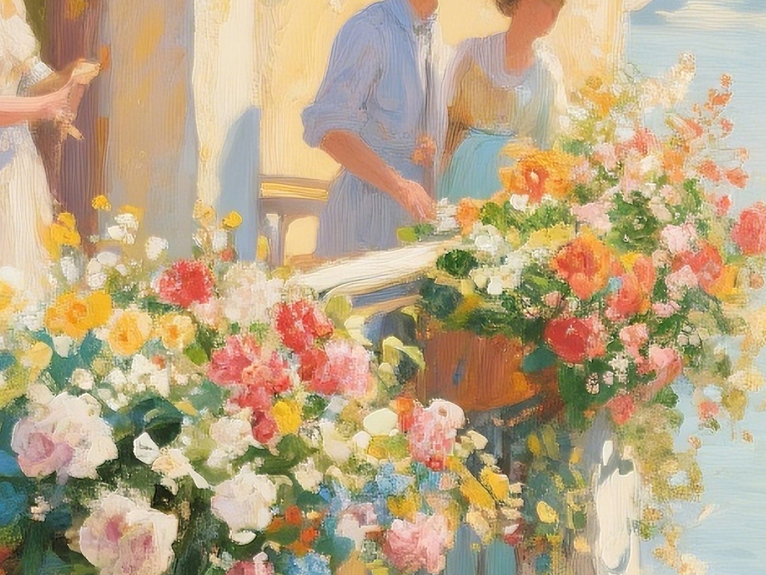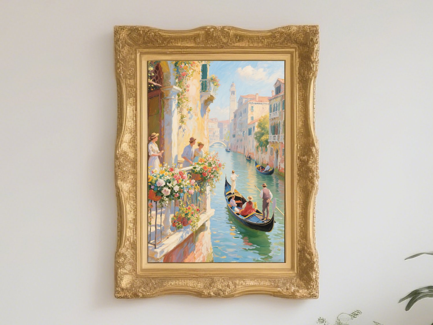 Flowers on the balcony along the canal add elements of health, healing, and personal growth. Hanging this artwork in your space helps cultivate balance, emotional calm, and energetic flow—perfect for manifesting prosperity and well-being in your everyday life.