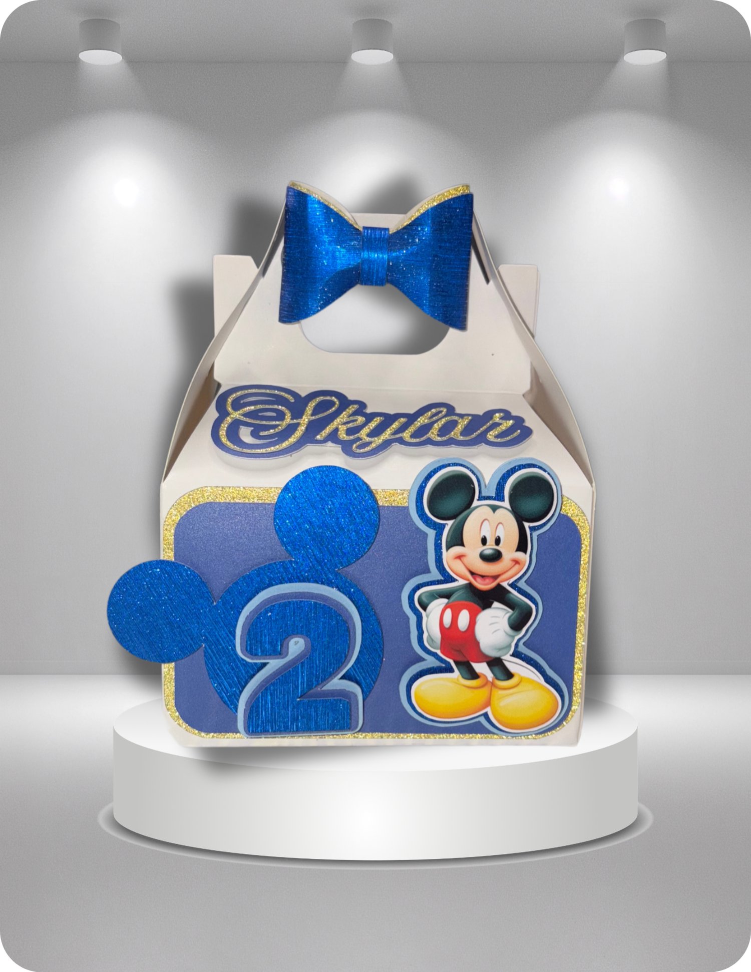 Create a magical party experience with this personalized mouse-themed favor box, perfect for toddler and kids’ birthday celebrations. Designed in a royal blue and gold color scheme, this custom favor box features a personalized name, age number, and a playful mouse character for a fun and memorable party detail.