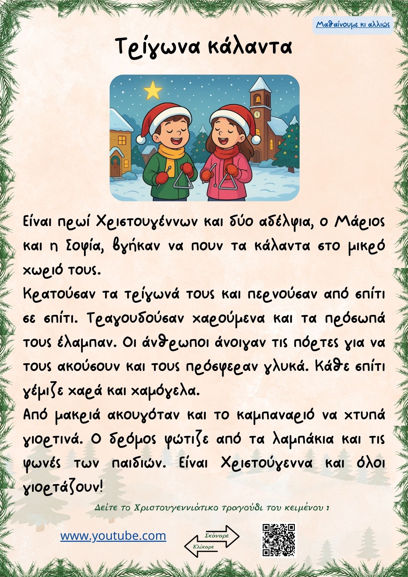 Το βιβλιαράκι αυτό περιλαμβάνει πέντε κείμενα με θέμα τα Χριστούγεννα, τα οποία απευθύνονται σε παιδιά Β΄- Γ΄ Δημοτικού και σε μαθητές Ειδικής αγωγής. Κάθε κείμενο συνοδεύεται από μία εικόνα καρτούν, 5 ερωτήσεις κατανόησης και ένα ξεχωριστό παιδικό τραγουδάκι.