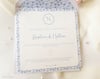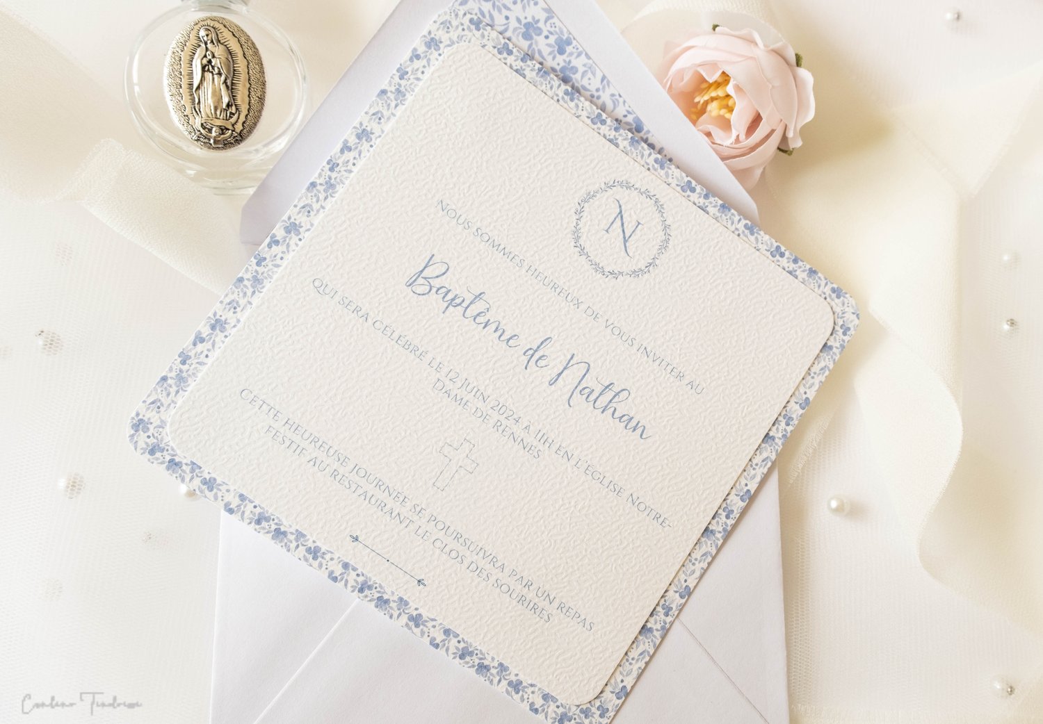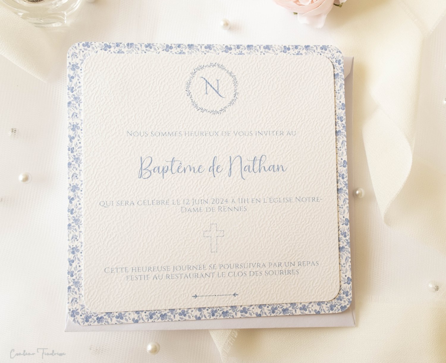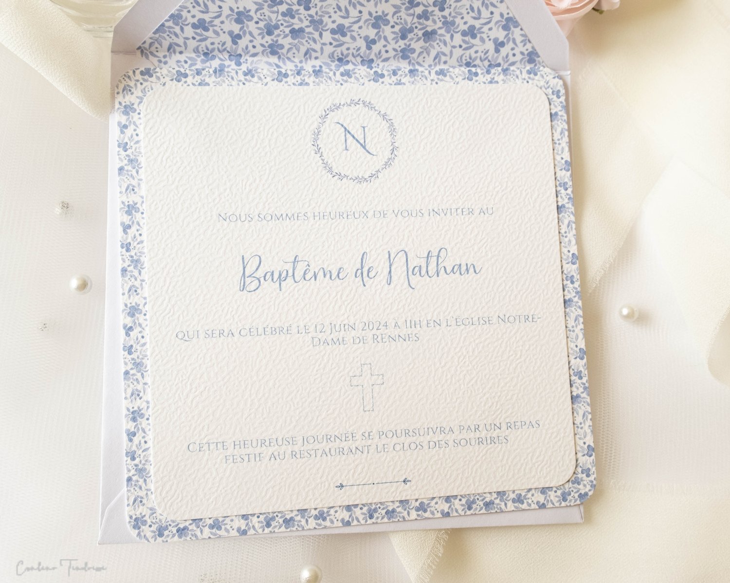 Ce faire-part est au format carré, de 13cm x 13cm. Les deux volets sont reliés par un nœud de satin, dont le coloris peut être modifié (le préciser dans le formulaire de personnalisation). Le faire-part est ici présenté sans le ruban, mais les deux volets collés ensemble. Préciser cette version si vous le souhaitez dans le formulaire de personnalisation.