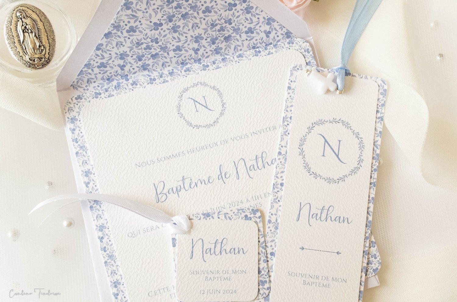 La collection Nathan réunit des éléments assortis : signets, faire-part, menus, marque-places…
