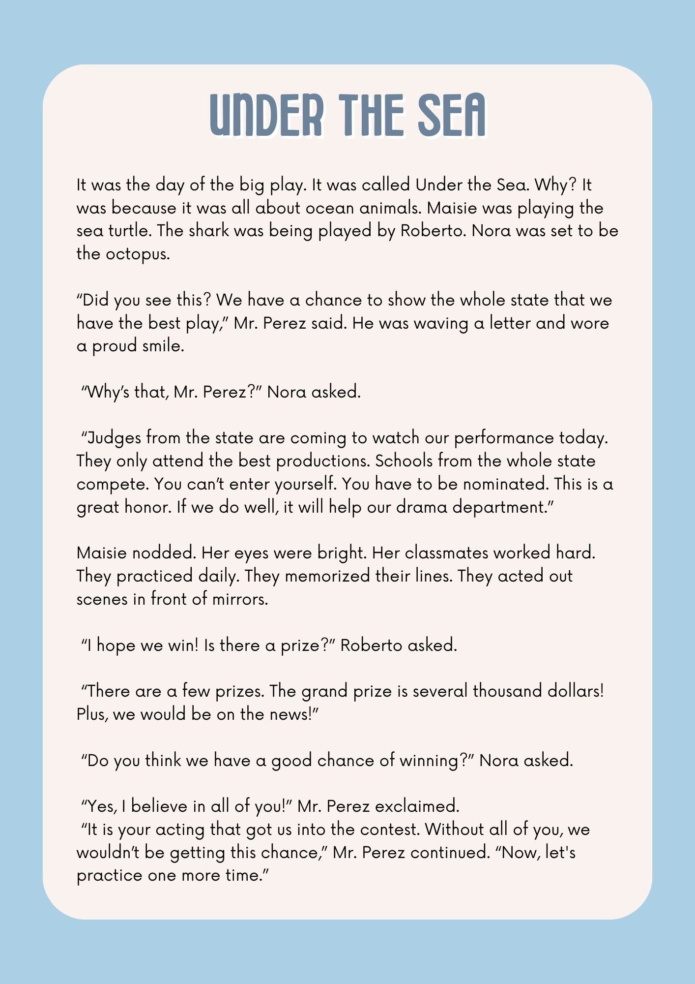 - A short, exciting story about a school play called Under the Sea featuring lively characters like Maisie the turtle, Roberto the shark, and Nora the octopus.