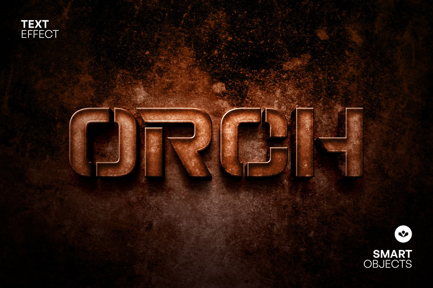 Rugged, metallic, industrial-style effect. Crafted from weathered, rusted metal, with deep shadows and beveled edges that create a strong 3D, embossed look. The surface texture includes scratches, oxidation, and darkened areas, giving it a worn, heavy, and gritty appearance.