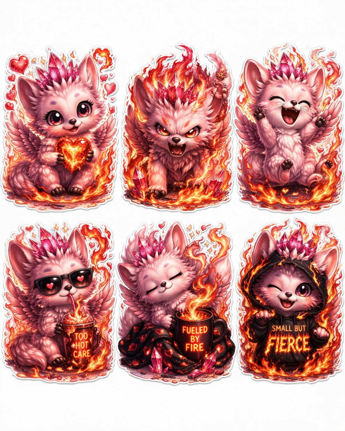 Meet the sassiest little pink crystal wolf you've ever seen โ holding a flaming heart, full rage mode, hysterically laughing, serving looks with sunglasses, fuelled by fire coffee and rocking her hoodie saying "Small But Fierce!" ๐ช๐