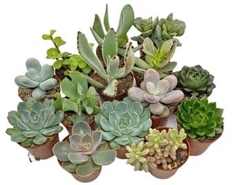 This collection of 5 succulent plants is perfect for a starter or for use in arrangements or terrariums. You will receive a selection of 5 succulent plants as pictured in 5.5cm pots. Succulents are easy to care for houseplants, a little water once a week during the months March to October, this is the succulent growing season and the rest of the year the plants are dormant. Succulent plant only size is around 5-10cm but all the plants vary. . You will receive 5 succulent plants in their pots - photos show a random selection of our plants, for illustration purposes only. you will receive mix of succulents from current stock.