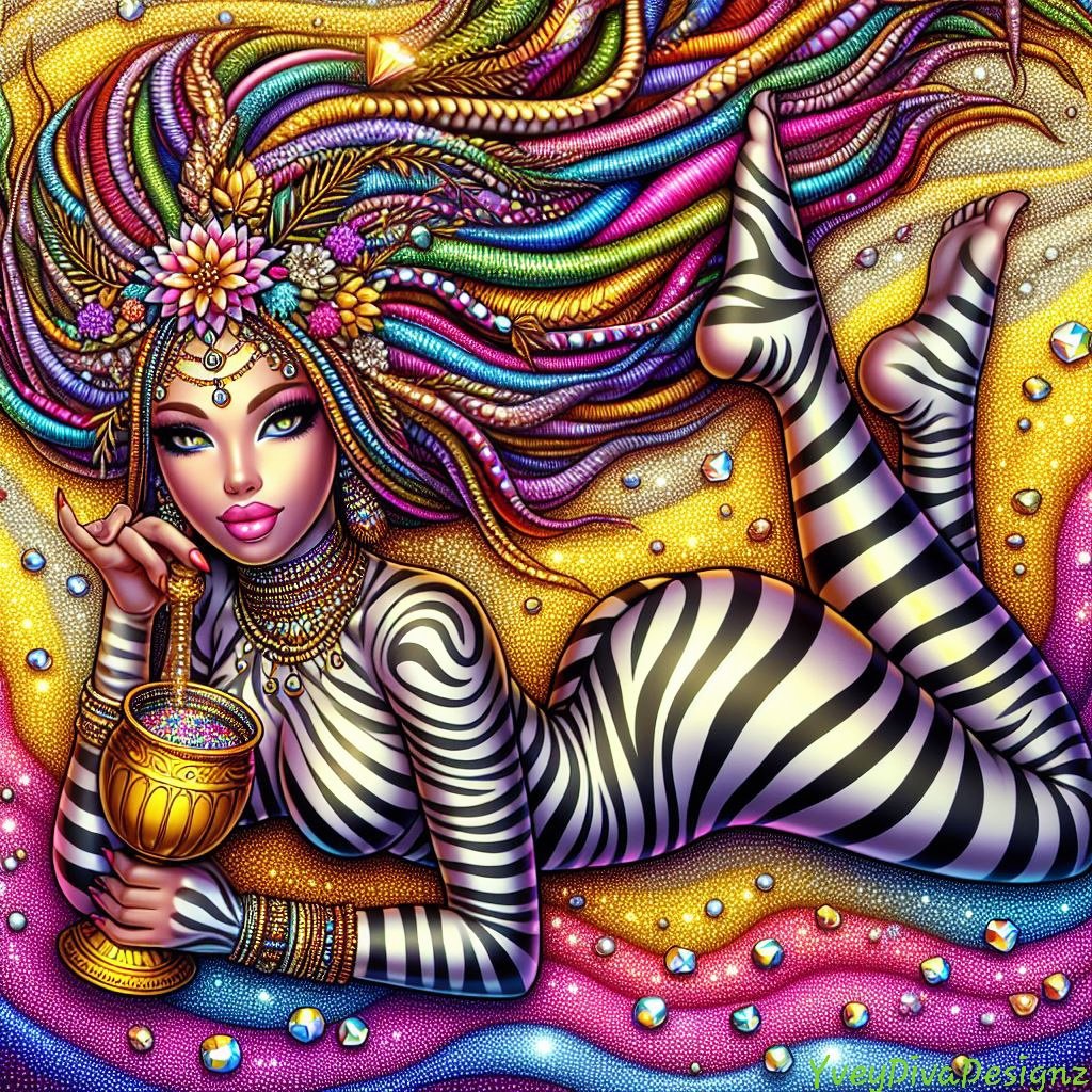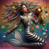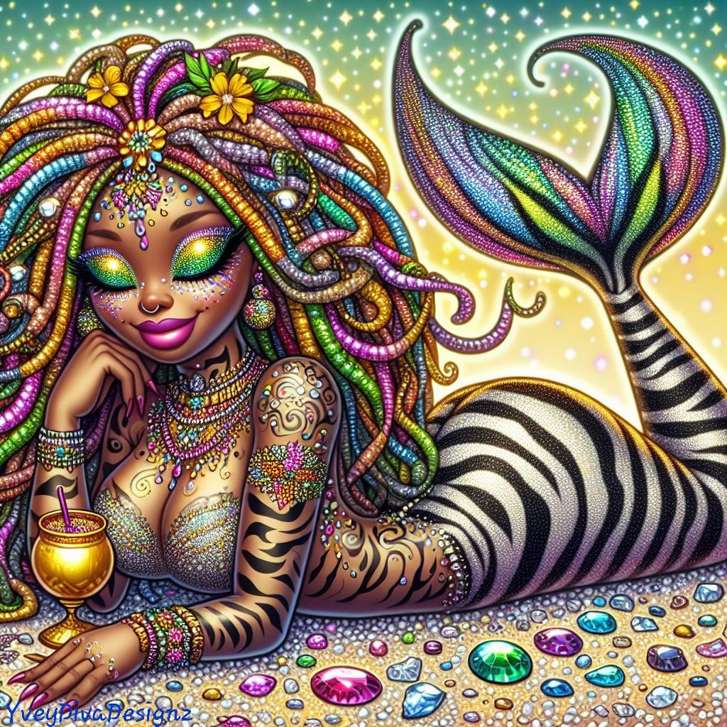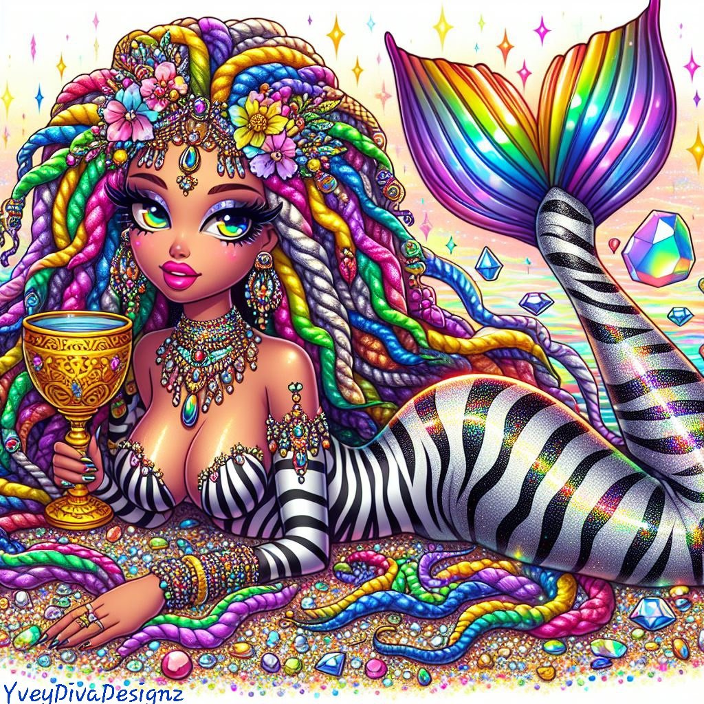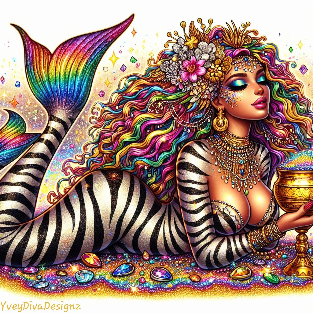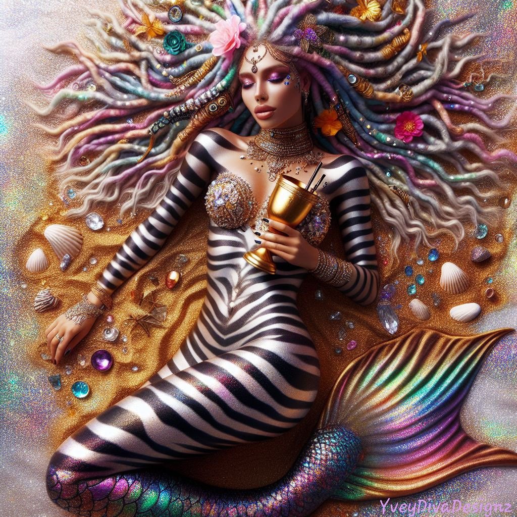Zebra Mermaid: Stripes of the Sea, portrays a whimsical captivating mermaid with a unique twist – her body adorned with zebra stripes from head to tail. Amidst the ocean's depths, her striking appearance captivates with its blend of marine elegance and terrestrial patterns, inviting viewers to marvel at the beauty of nature's diversity.