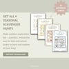 - 4 seasonal scavenger hunt sets: Spring, Summer, Autumn, and Winter