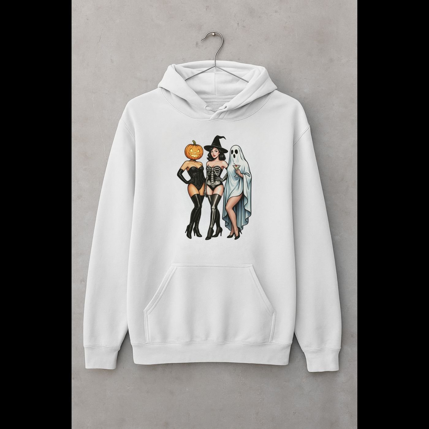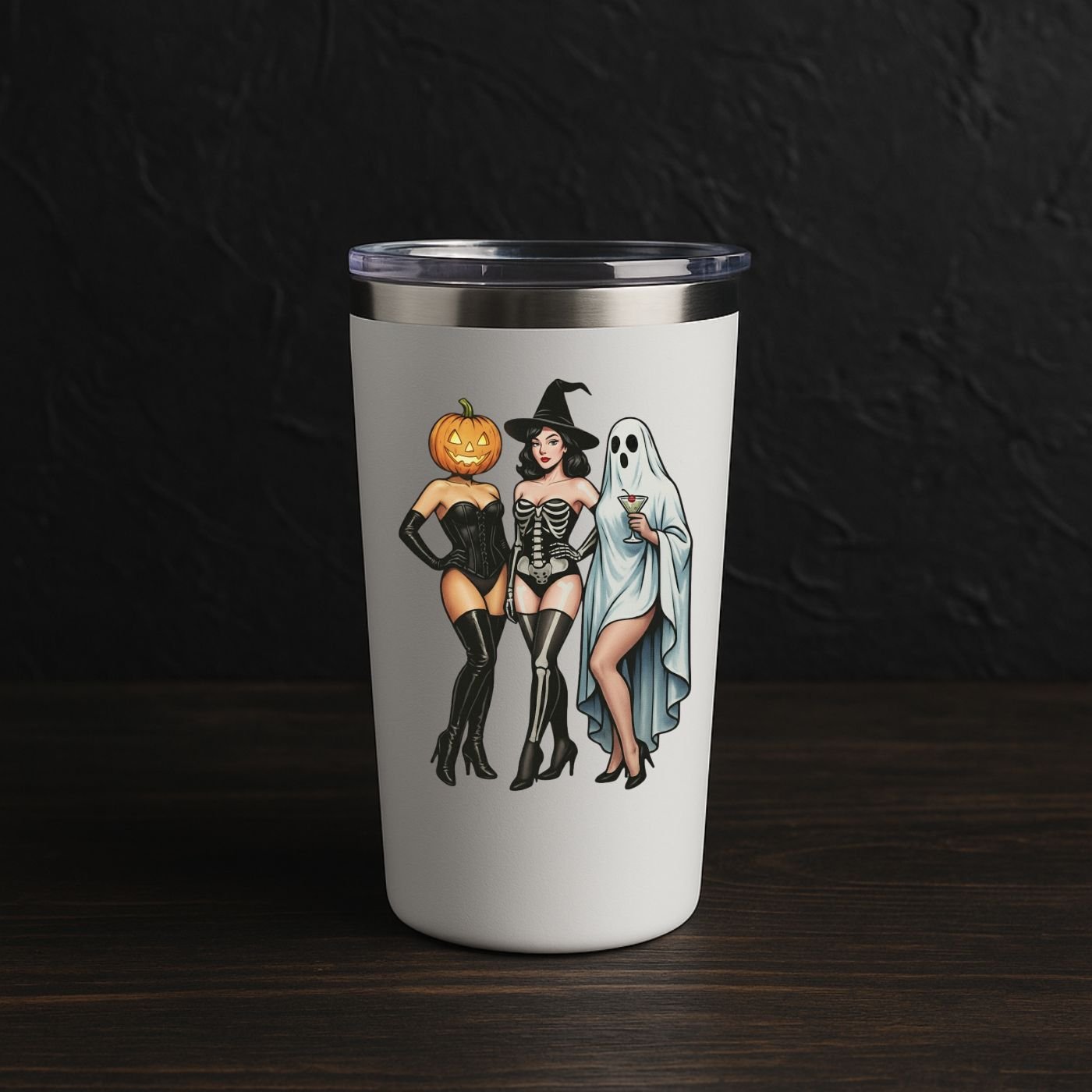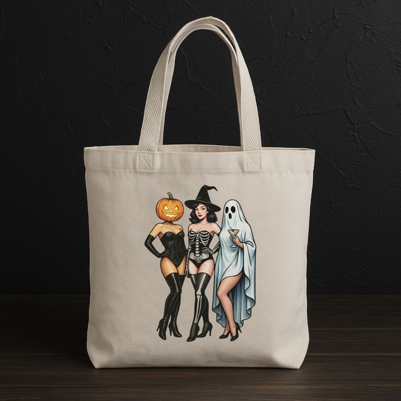 Turn up the spooky glam with this Gothic Halloween Pin-Up Trio PNG — featuring three stunning Halloween babes: a seductive pumpkin head beauty in a corset, a sultry skeleton witch, and a chic ghost holding a cocktail.