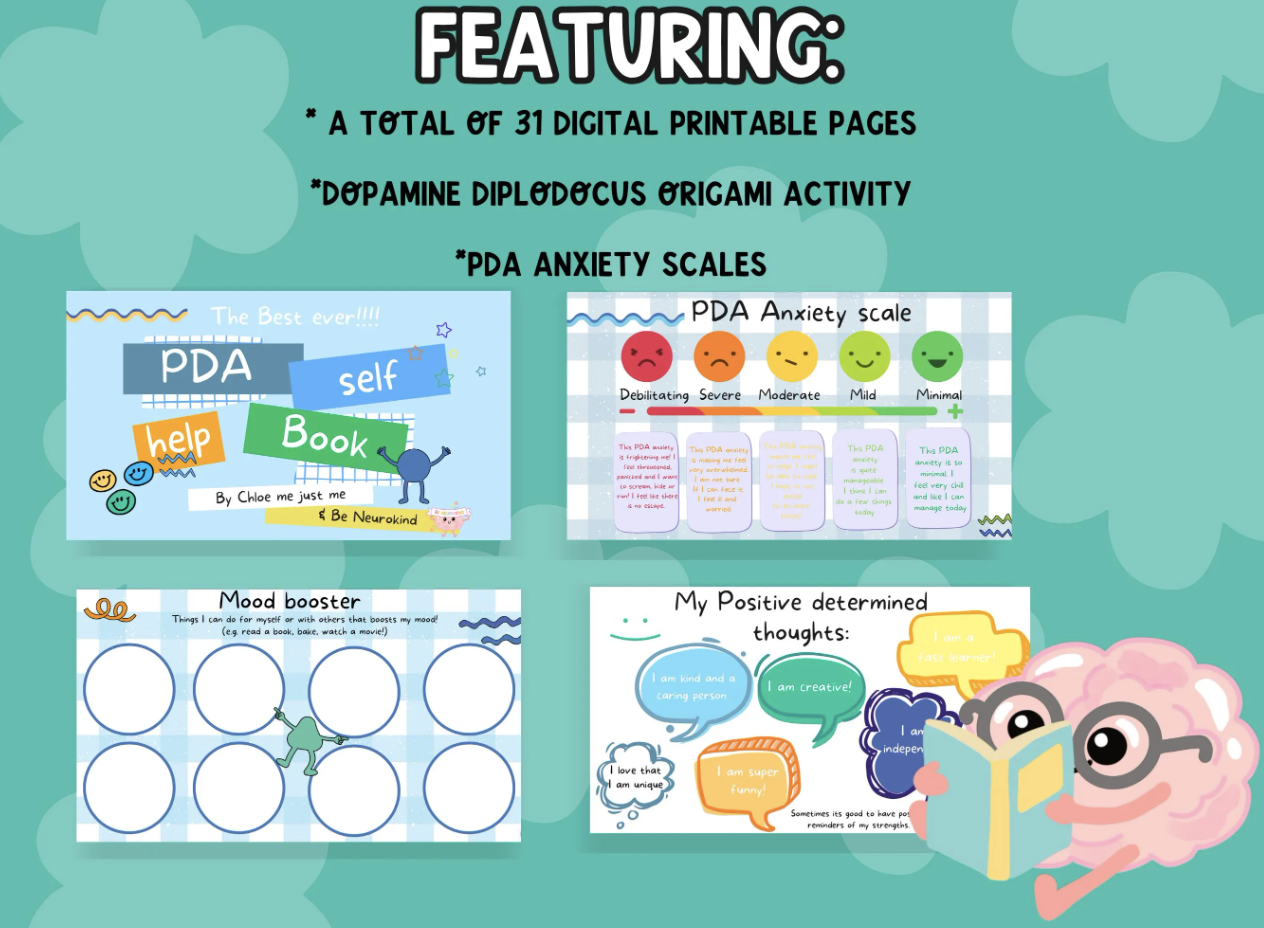 Designed with an invitation for the readers to be able to write in their own thoughts and experiences with PDA/ neurodivergent friendly language. We believe our printable is inclusive and less demanding with fun activities that allow children to think about their own neurodivergency and allow them to process and understand their lived experiences and how their brain works.