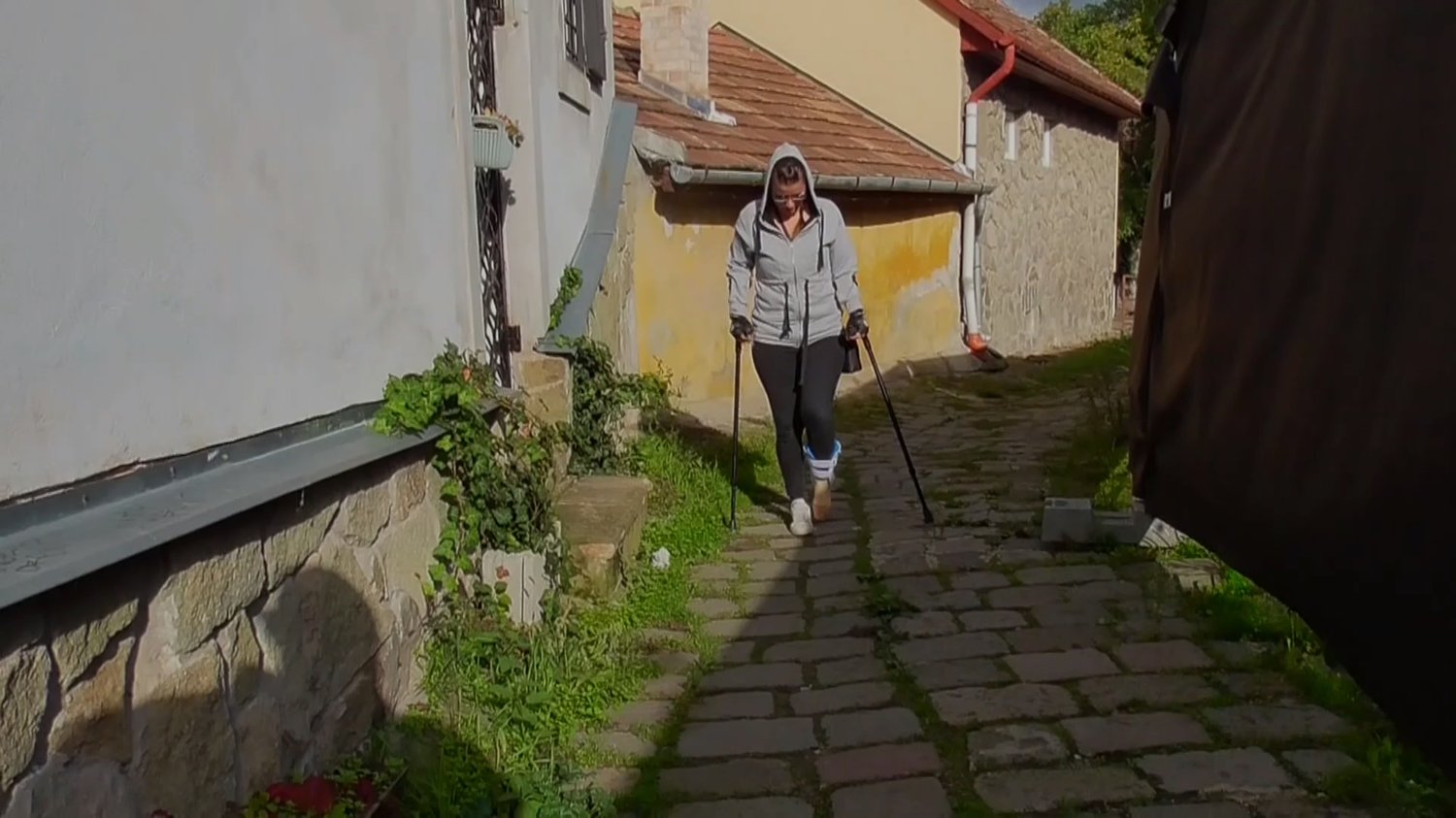 Lucy’s sprained foot is wrapped up in a bandage inside of the white air cast that she’s wearing today, her cute little toes are sticking out of the bandage in a nude pantyhose but that’s okay, the weather is pretty nice today. Lucy is crutching down a very uneven cobblestone street and has to be very careful with where she put her crutches down at. She doesn’t want to fall again now that she’s already hurt. The street may be out of cobblestone but the town is pretty cozy, it has got colourful houses lined up along the way. Lucy has to take short breaks sometimes when the pain catches up, she stops whenever she needs to. Finally Lucy finds a bench to sit on for a while to stretch her foot at, a close up is being filmed when she takes the air cast off and jumps to the wall for a better view over the town.