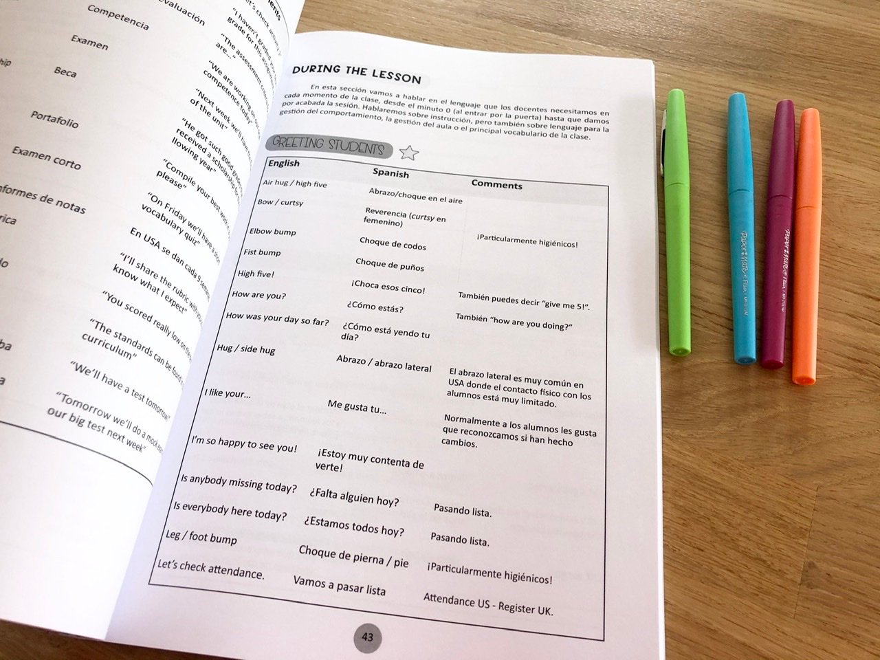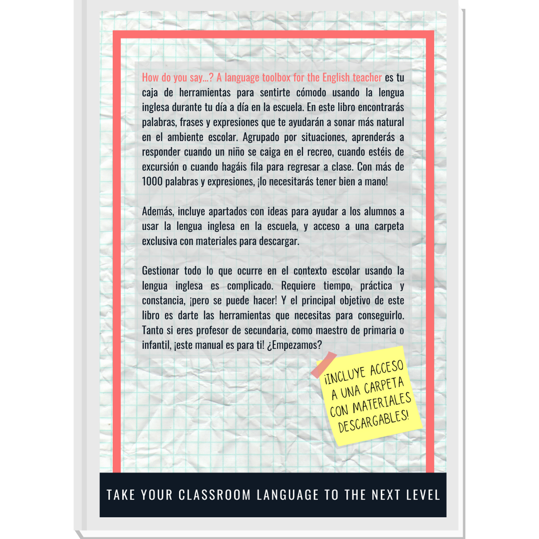 💬How do you say…? A language toolbox for the English teacher 💬es tu caja de herramientas para sentirte cómoda usando la lengua inglesa durante tu día a día en la escuela. En este libro encontrarás palabras, frases y expresiones que te ayudarán a sonar más natural en el ambiente escolar. Agrupado por situaciones, aprenderás a responder cuando un niño se caiga en el recreo, cuando estéis de excursión o cuando hagáis fila para regresar a clase. Con más de 1000 palabras y expresiones, ¡lo necesitarás tener bien a mano!
